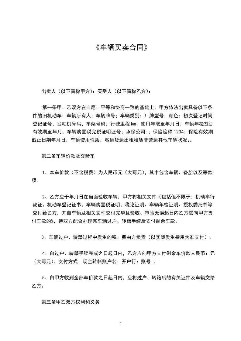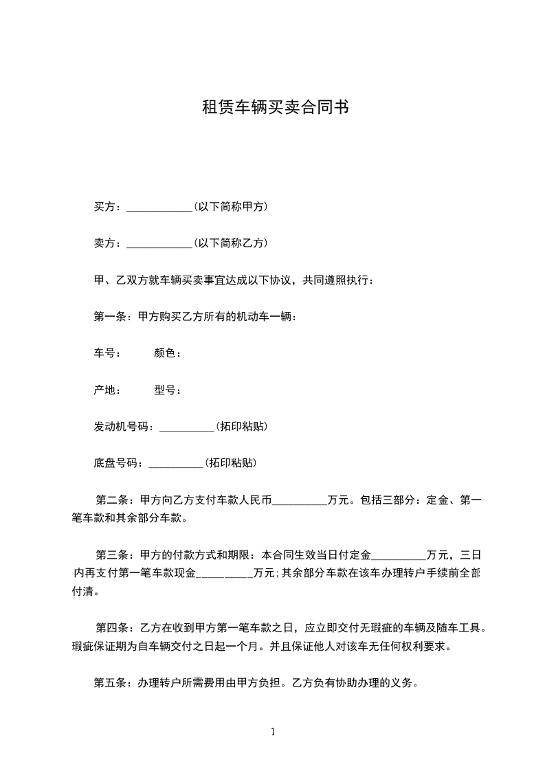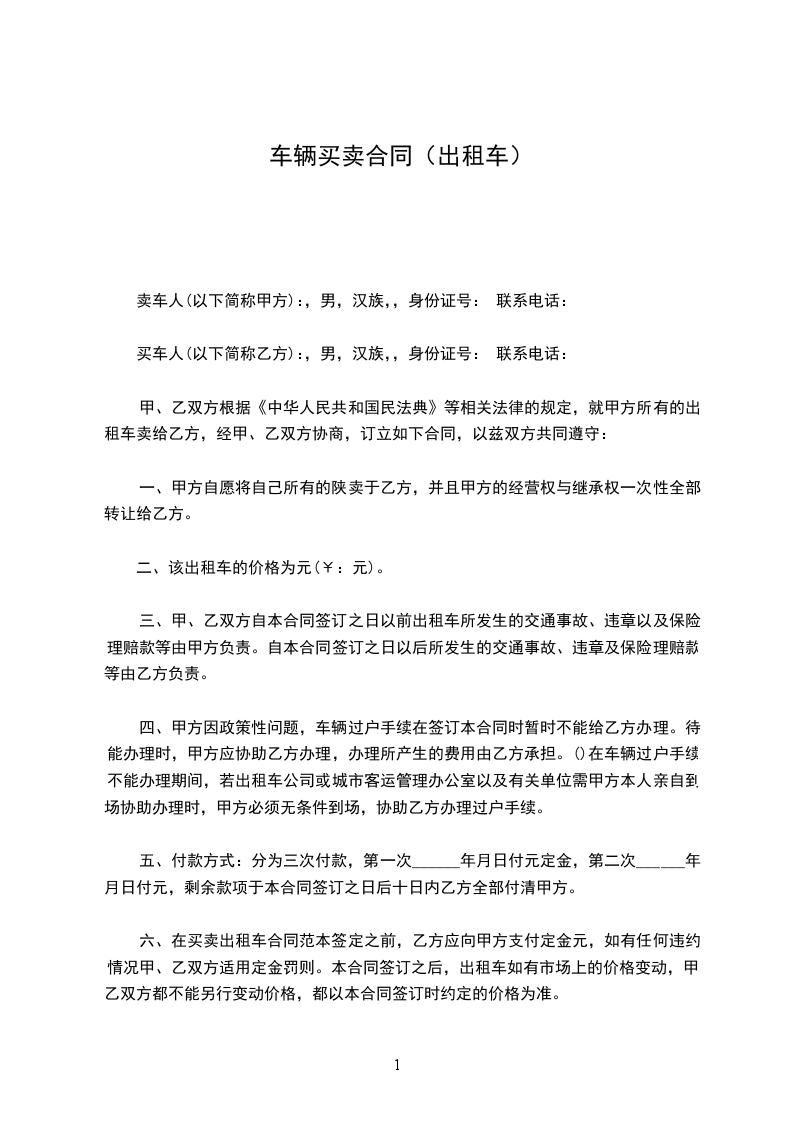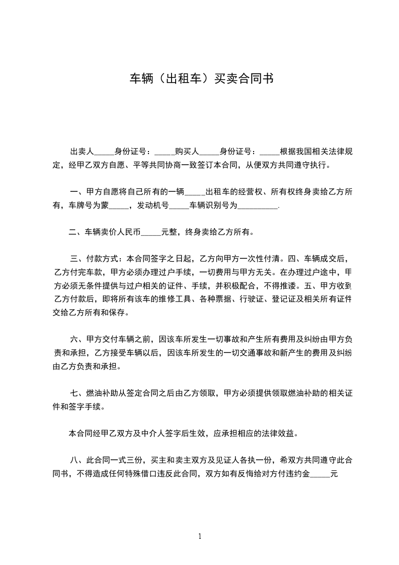 一、甲方自愿将自己所有的一辆_____出租车的经营权、所有权终身卖给乙方所有,车牌号为蒙_____,发动机号_____车辆识别号为__________.