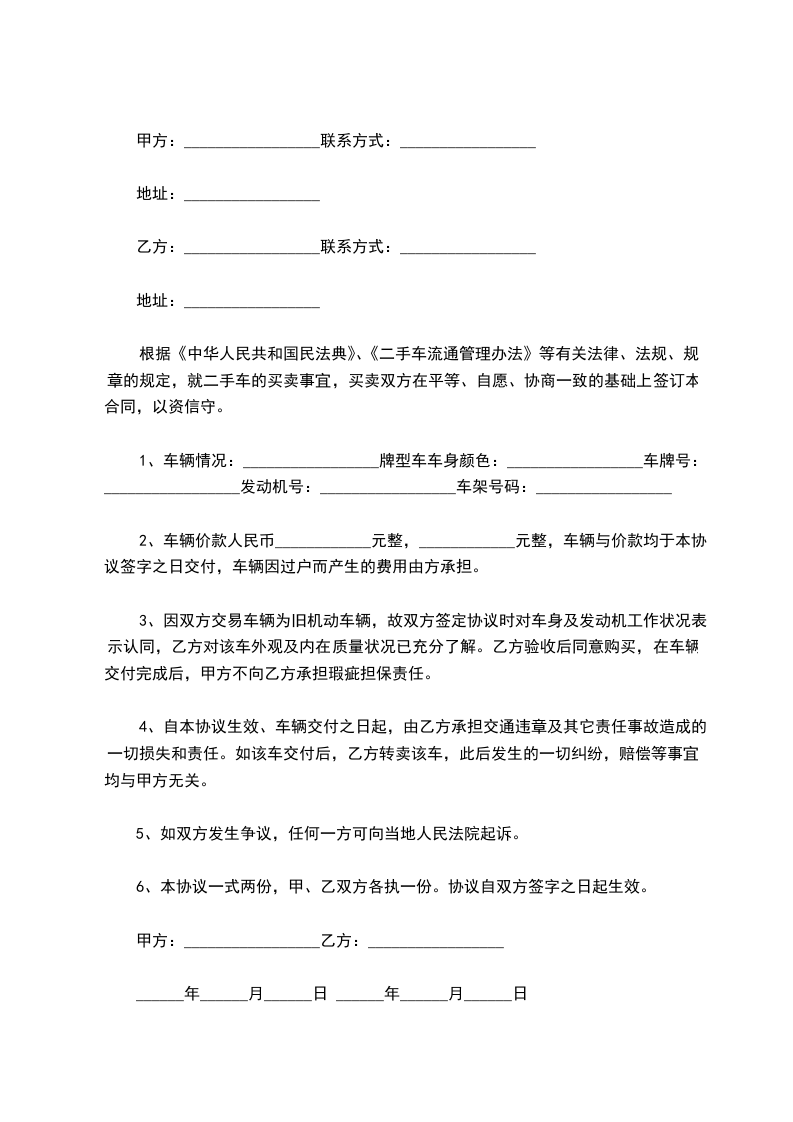 根据《中华人民共和国民法典》、《二手车流通管理办法》等有关法律、法规、规章的规定,就二手车的买卖事宜,买卖双方在平等、自愿、协商一致的基础上签订本合同,以资信守。