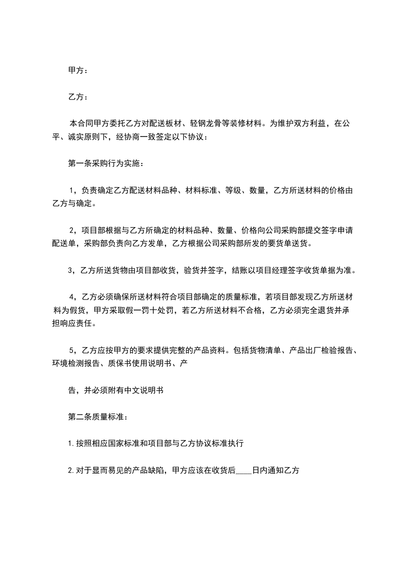 本合同甲方委托乙方对配送板材、轻钢龙骨等装修材料。为维护双方利益,在公平、诚实原则下,经协商一致签定以下协议: