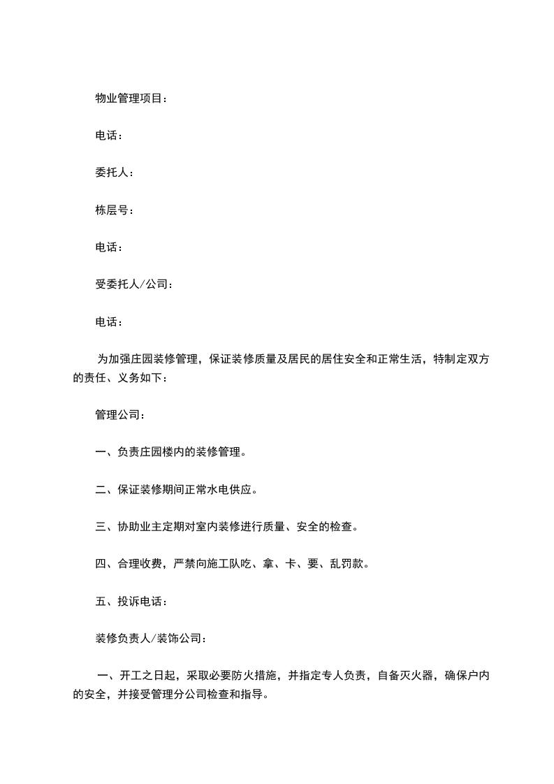 一、开工之日起,采取必要防火措施,并指定专人负责,自备灭火器,确保户内的安全,并接受管理分公司检查和指导。