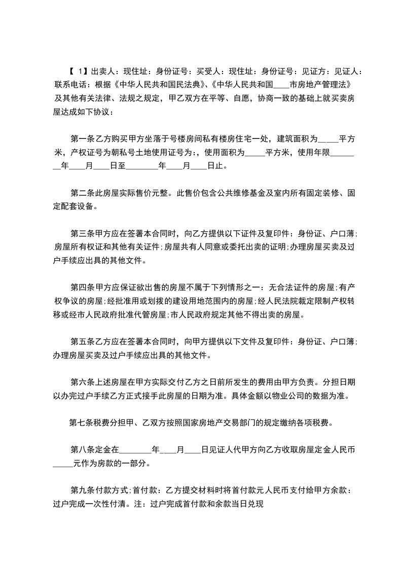 【1】出卖人:现住址:身份证号:买受人:现住址:身份证号:见证方:见证人:联系电话:根据《中华人民共和国民法典》、《中华人民共和国____市房地产管理法》及其他有关法律、法规之规定,甲乙双方在平等、自愿,协商一致的基础上就买卖房屋达成如下协议:
