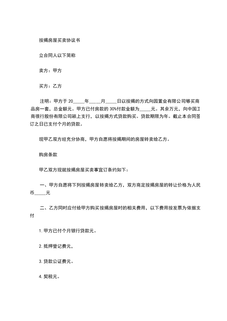 注明:甲方于20_____年_____月_____日以按揭的方式向园置业有限公司够买商品房一套,总金额元。甲方已付房款的30%付款金额为_____元。其余万元,向中国工商很行股份有限公司颍上支行,以按揭方式贷款购买。贷款期限为年。截止本合同签订之日已支付个月的贷款。