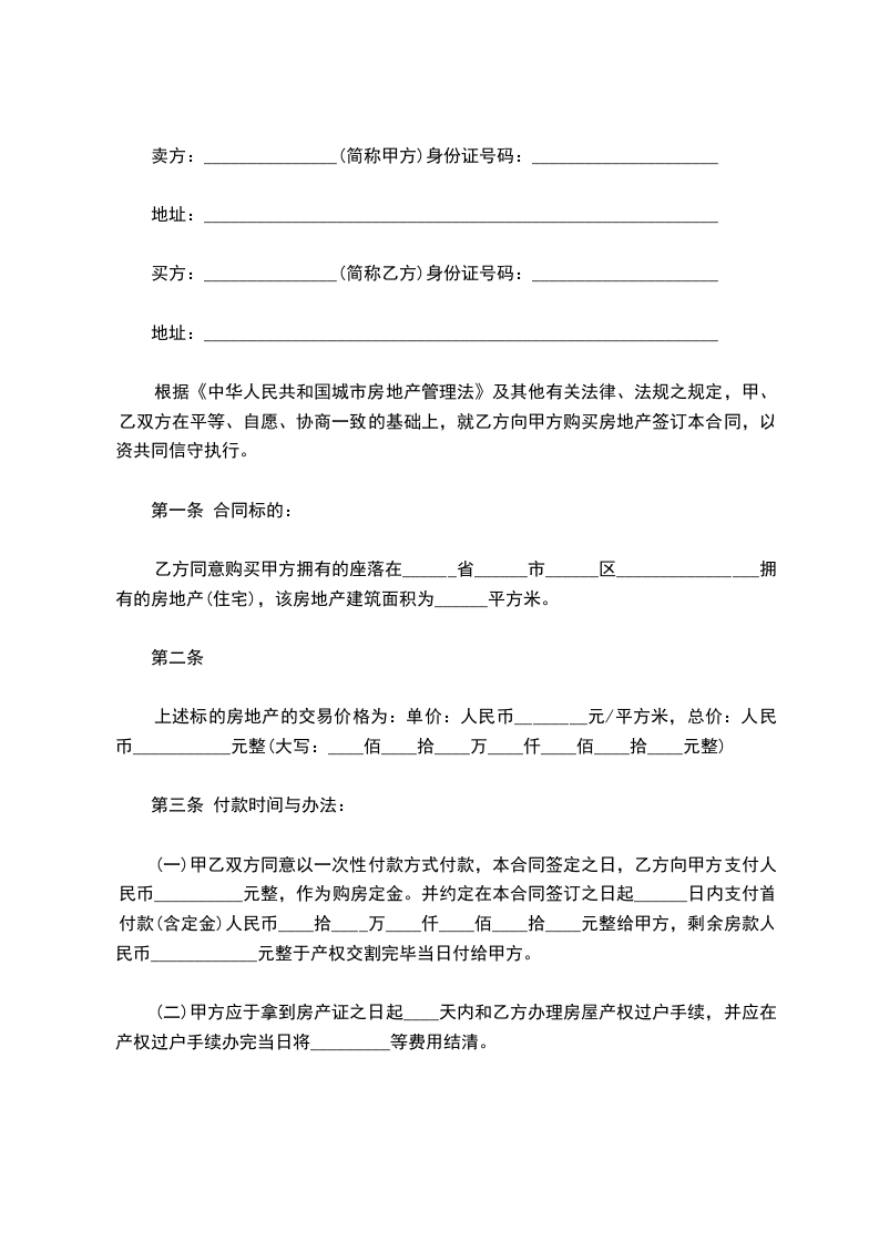 2、甲乙双方同意以一次性付款方式付款,并约定在房地产交易中心缴交税费当日支付首付款人民币____拾____万____仟____佰____拾____元整给甲方,剩余房款人民币____________元整于产权交割完毕当日付给甲方。