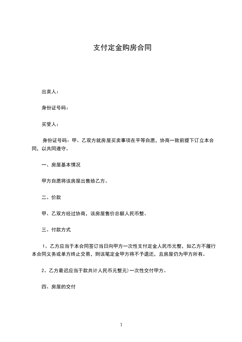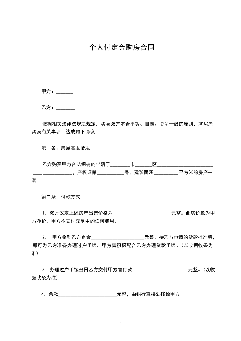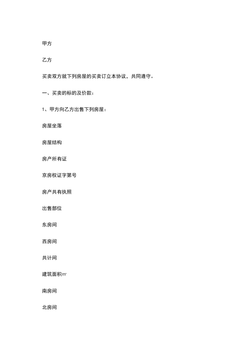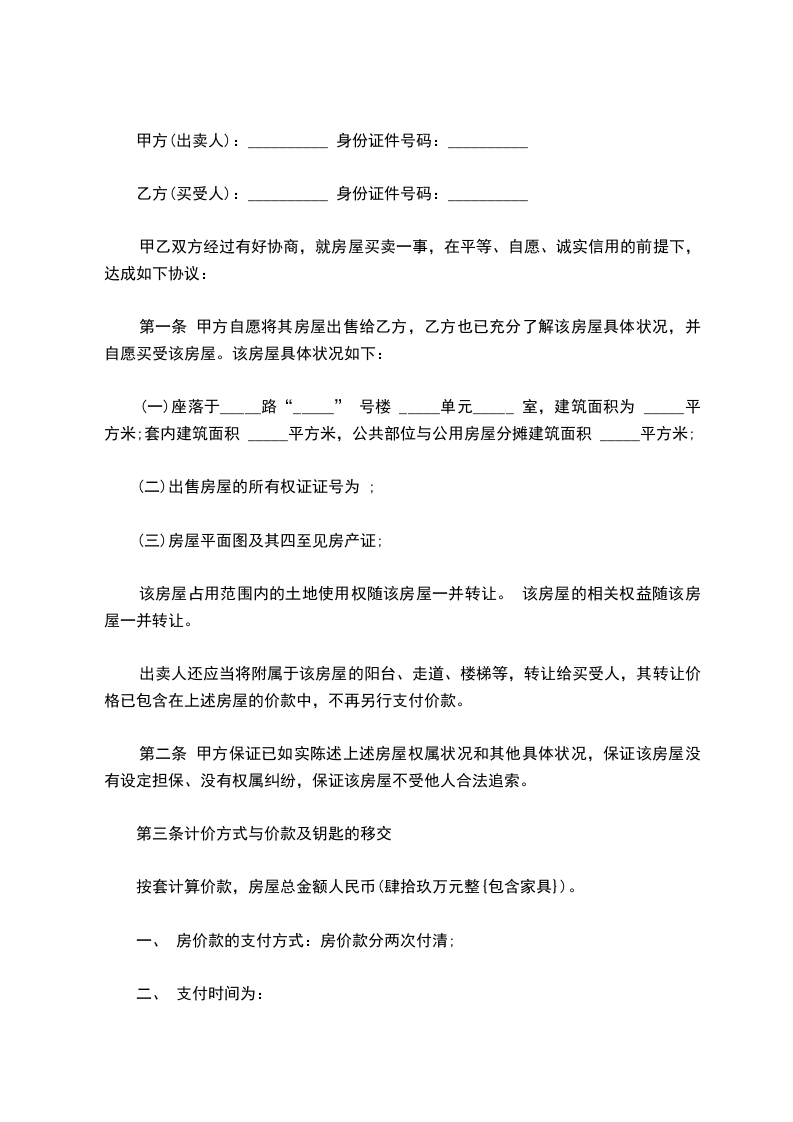 第一条甲方愿将座落_______市_______区______街____段______号的_____房卖于乙方,永远为业,空口无凭,立字据为证。