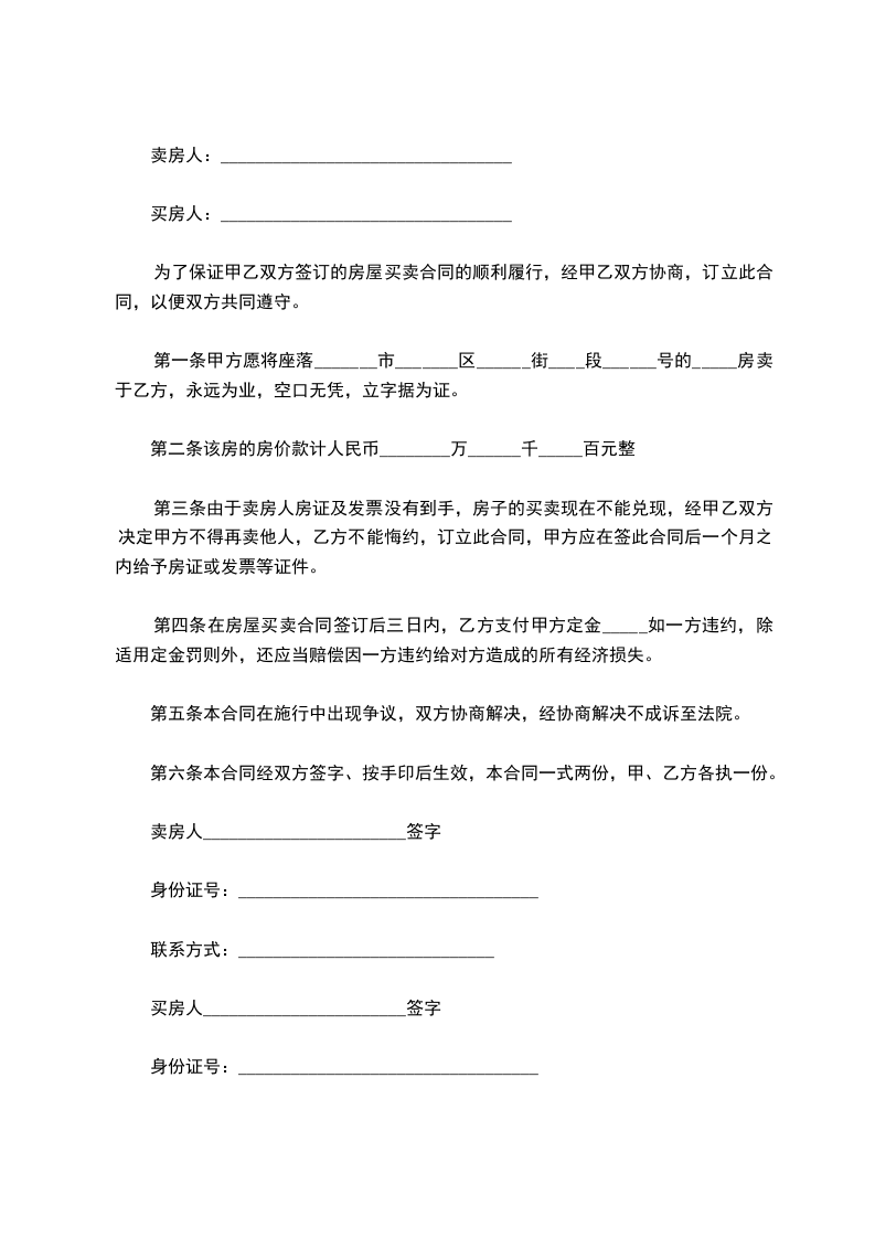 第三条由于卖房人房证及发票没有到手,房子的买卖现在不能兑现,经甲乙双方决定甲方不得再卖他人,乙方不能悔约,订立此合同,甲方应在签此合同后一个月之内给予房证或发票等证件。