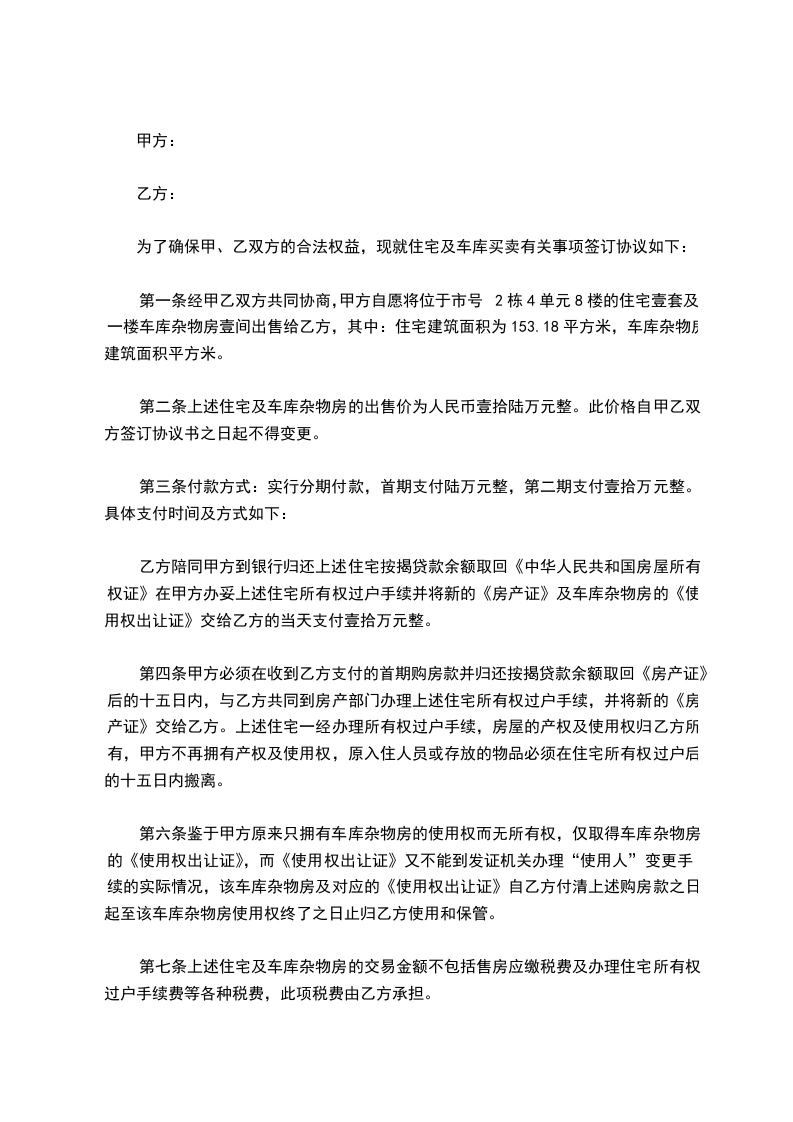 为了确保甲、乙双方的合法权益,现就住宅及车库买卖有关事项签订协议如下: