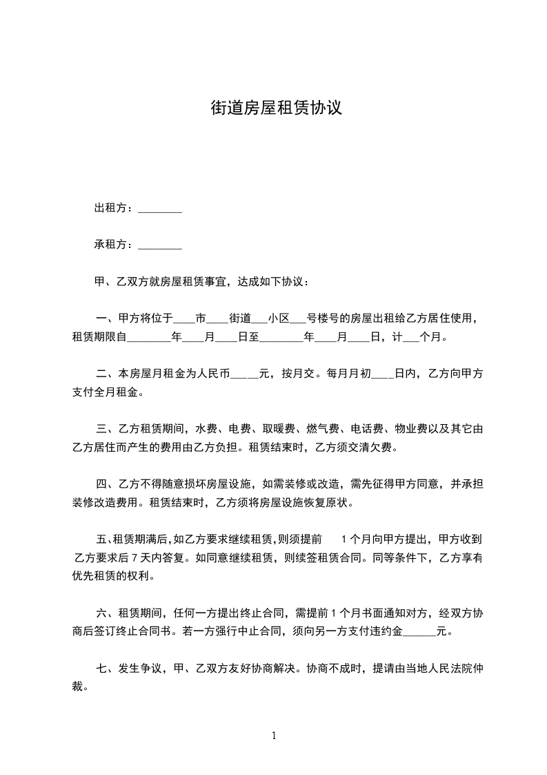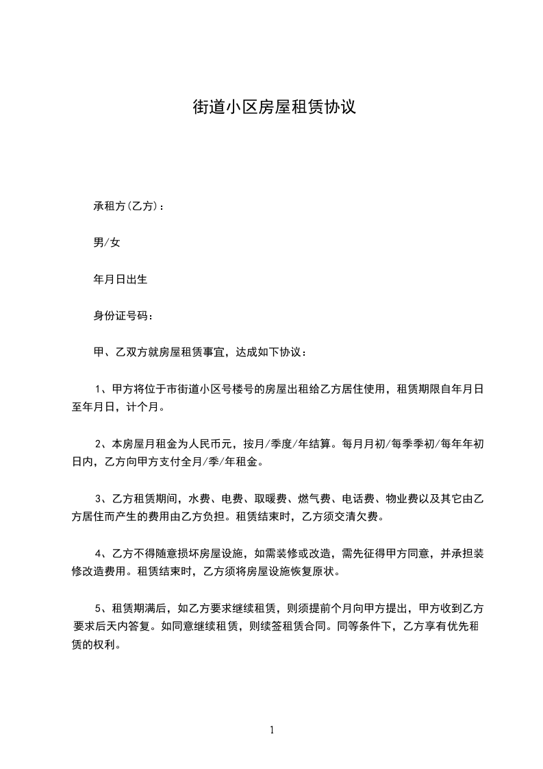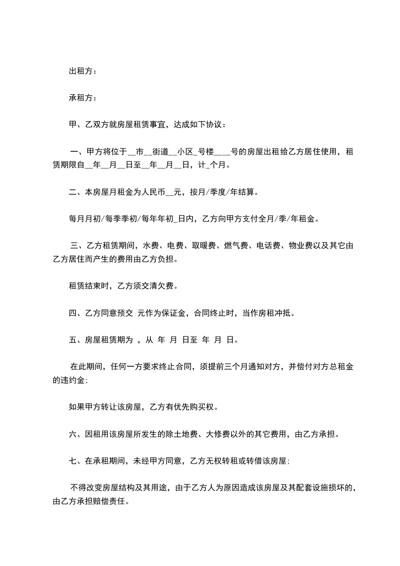 一、甲方将位于____市____街道___小区___号楼号的房屋出租给乙方居住使用,租赁期限自________年____月____日至________年____月____日,计___个月。