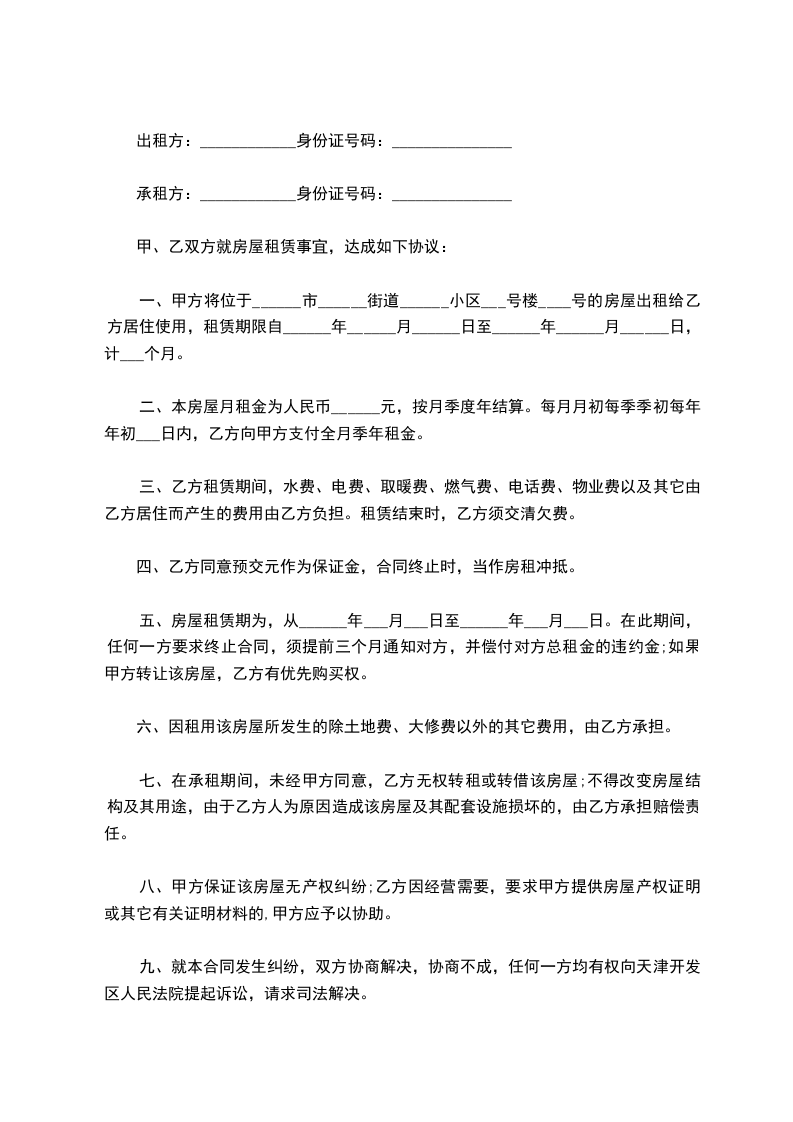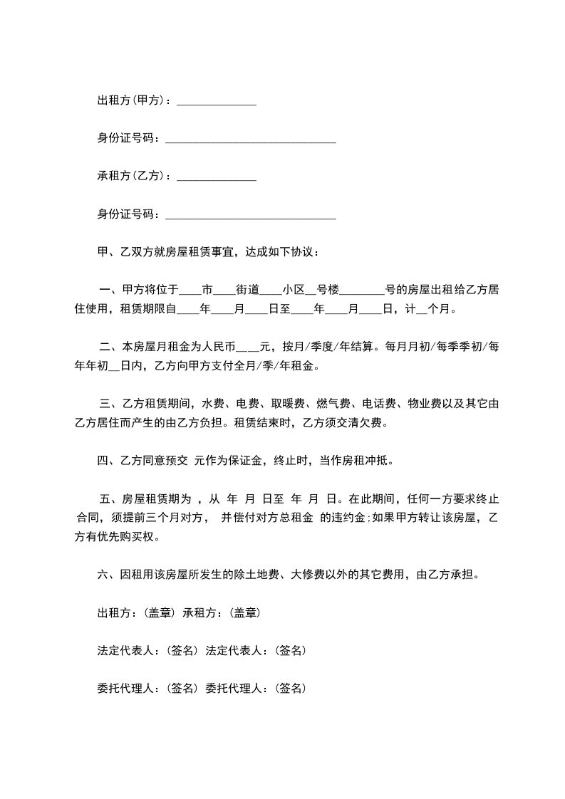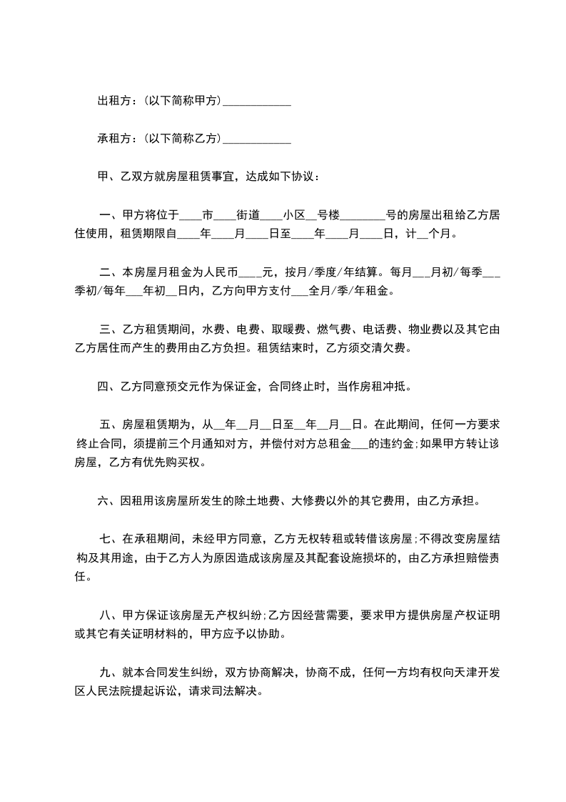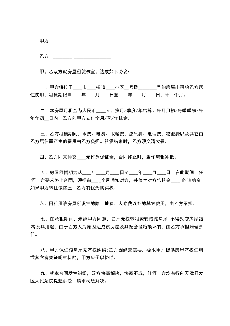 一、甲方将位于____市____街道___小区___号楼号的房屋出租给乙方居住使用,租赁期限自________年____月____日至________年____月____日,计___个月。
