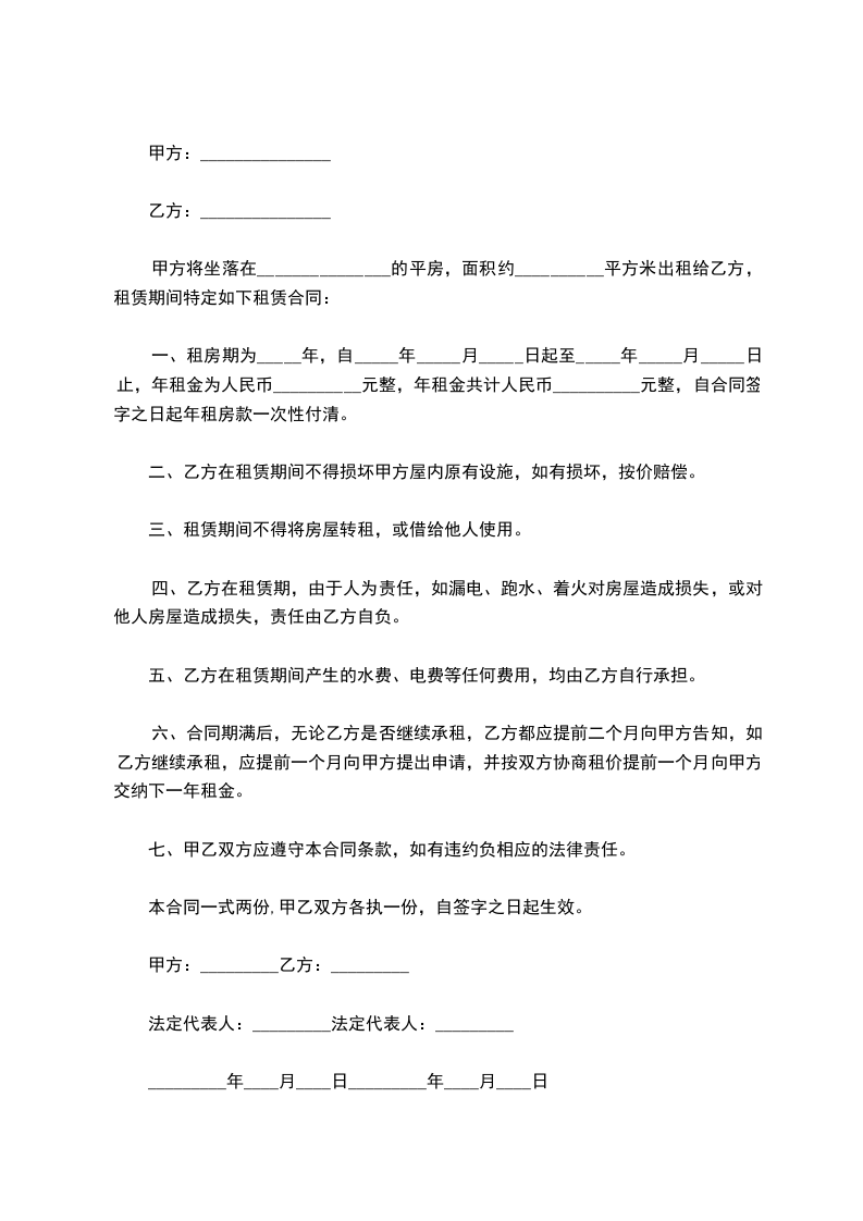 甲方将坐落在_______________的平房,面积约__________平方米出租给乙方,租赁期间特定如下租赁合同: