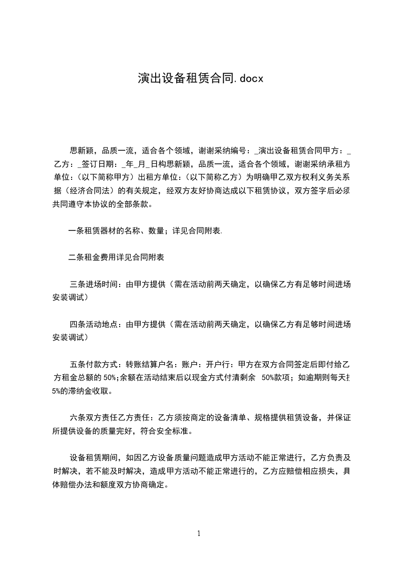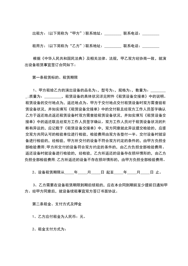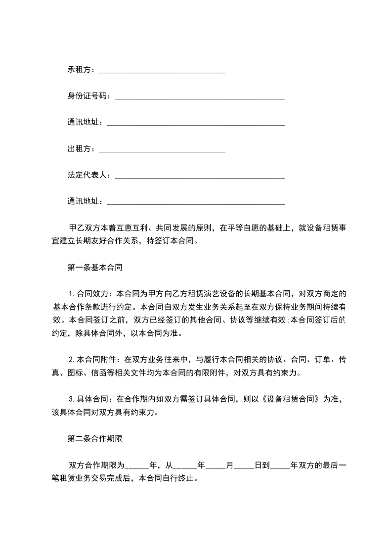 1.合同效力:本合同为甲方向乙方租赁演艺设备的长期基本合同,对双方商定的基本合作条款进行约定。本合同自双方发生业务关系起至在双方保持业务期间持续有效。本合同签订之前,双方已经签订的其他合同、协议等继续有效;本合同签订后的约定,除具体合同外,以本合同为准。