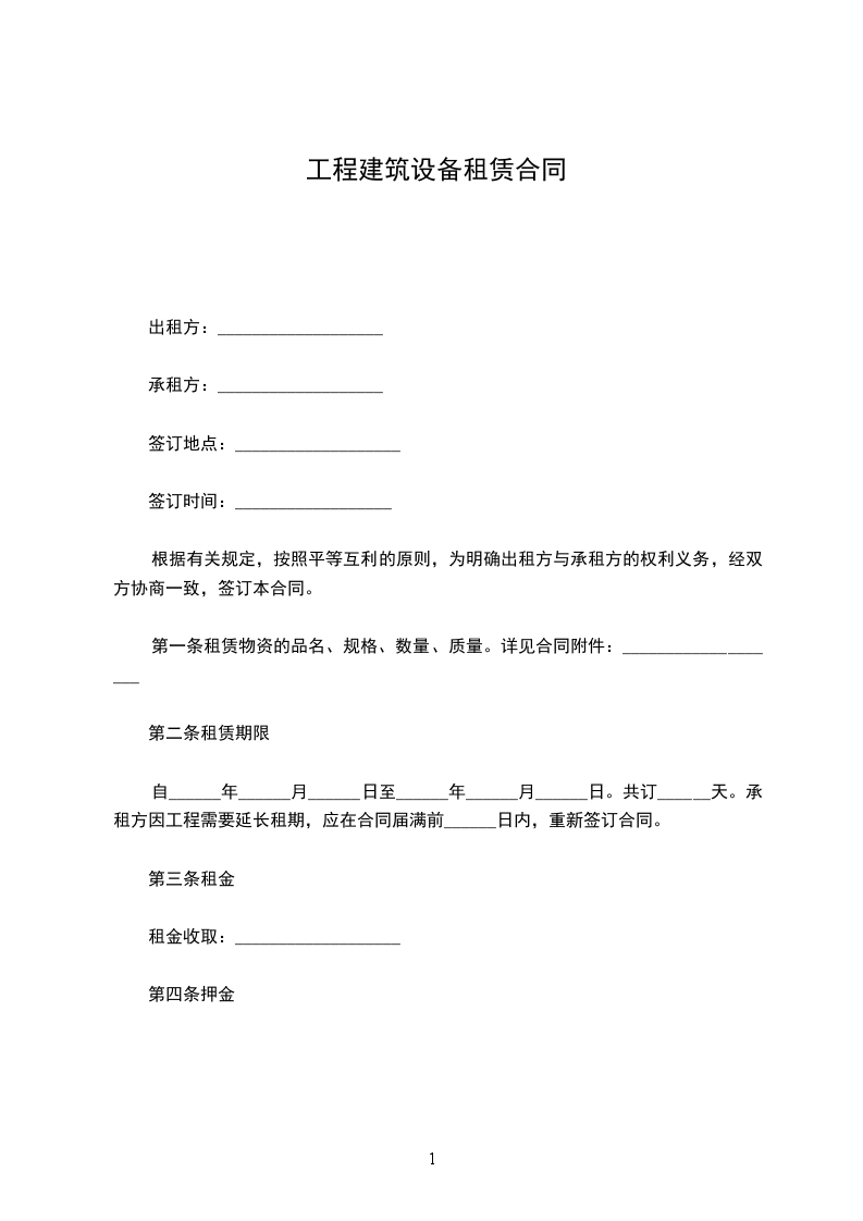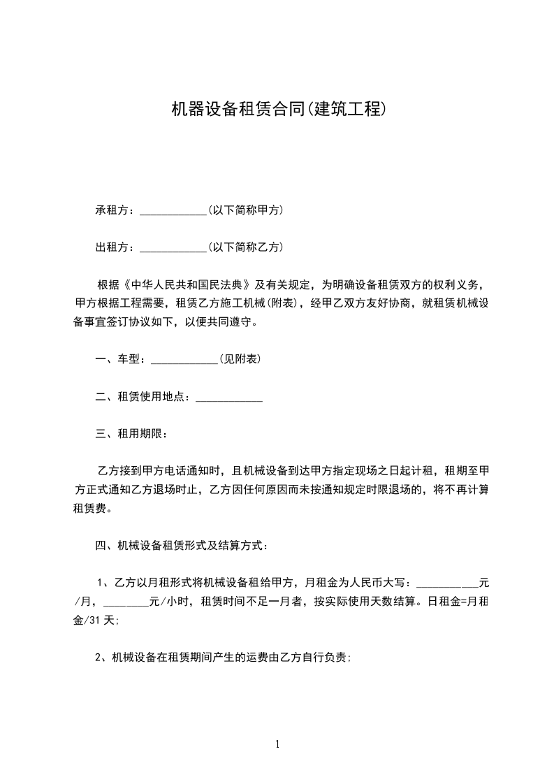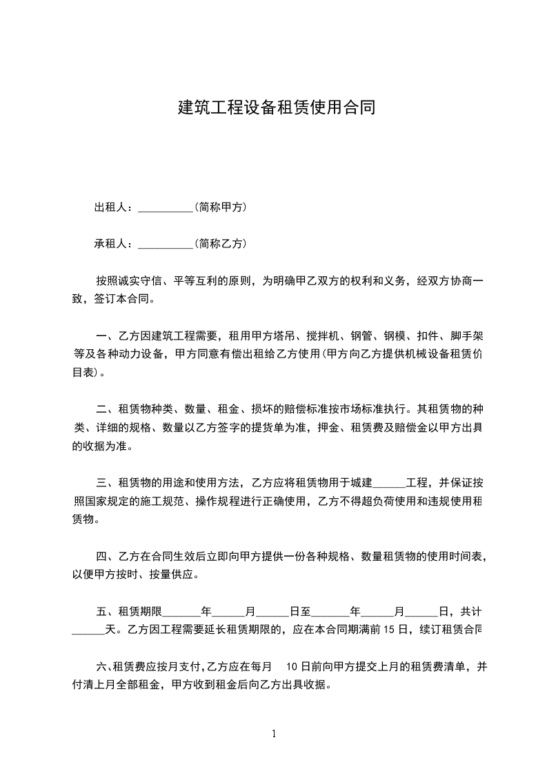 自______年______月______日至______年______月______日。共订______天。承租方因工程需要延长租期,应在合同届满前______日内,重新签订合同。