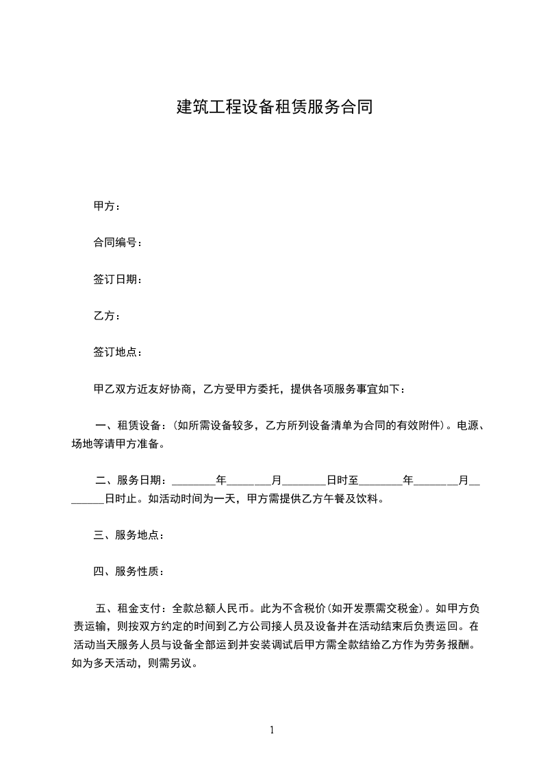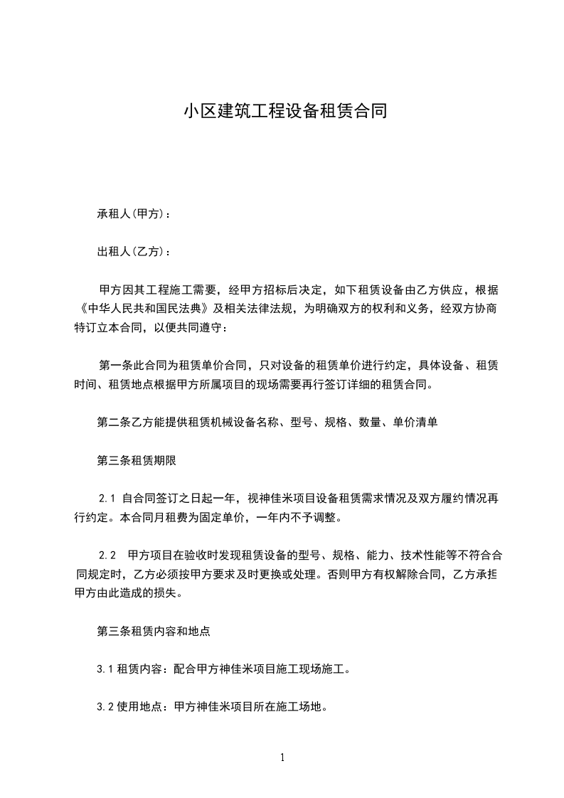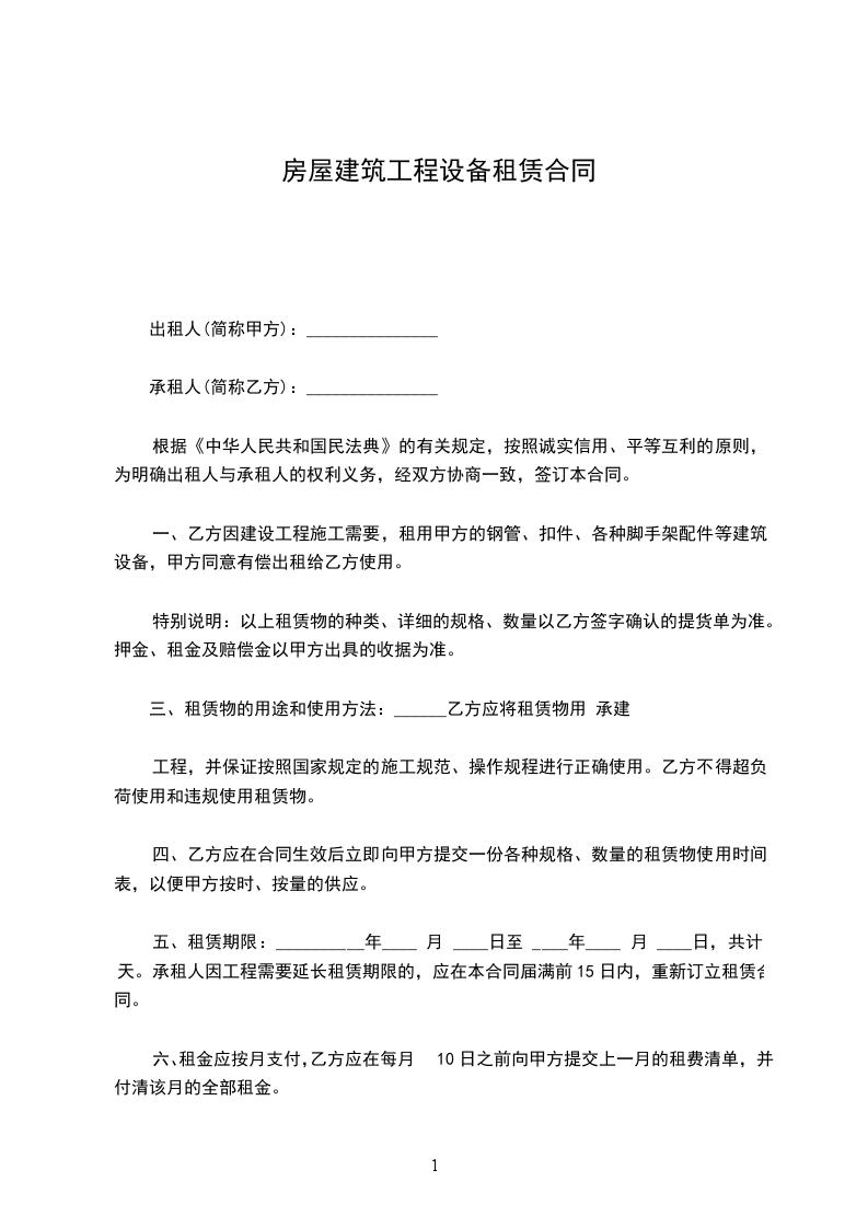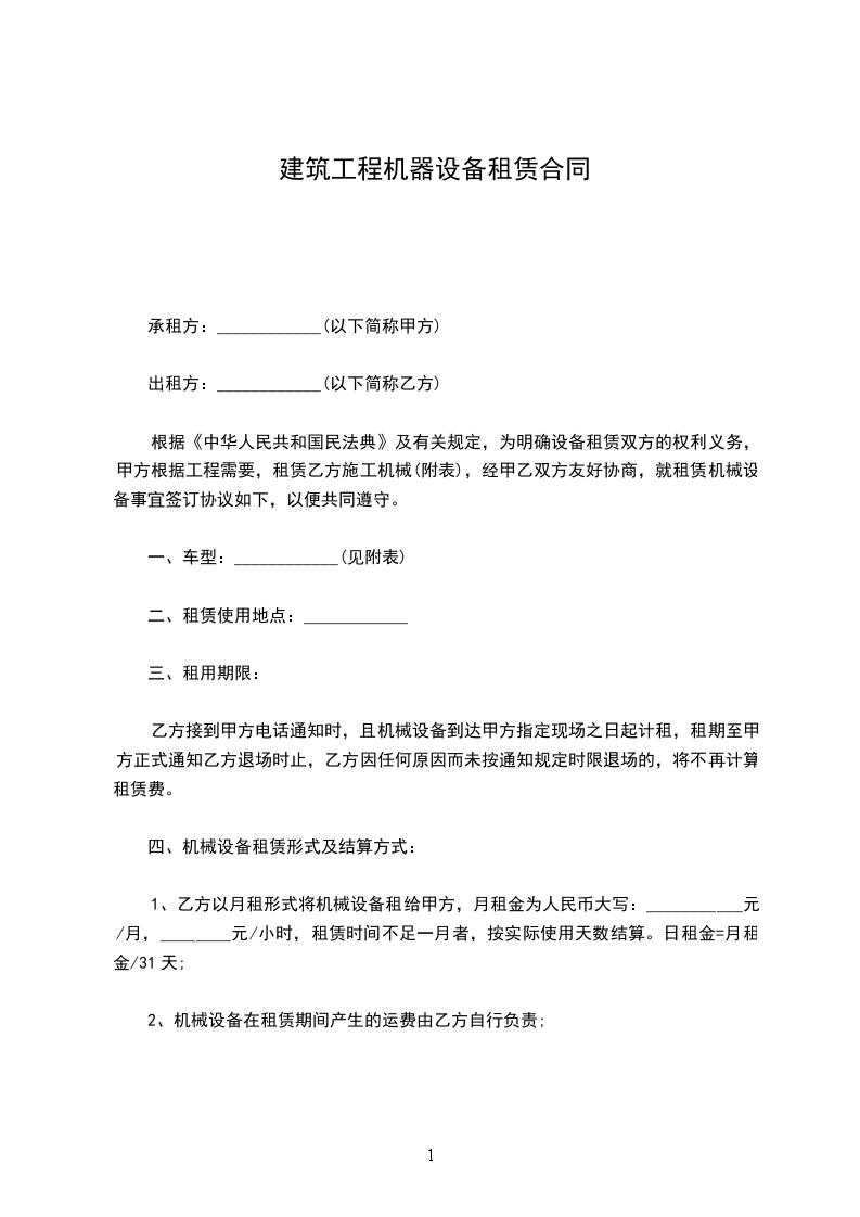 自______年______月______日至______年______月______日。共订______天。承租方因工程需要延长租期,应在合同届满前______日内,重新签订合同。