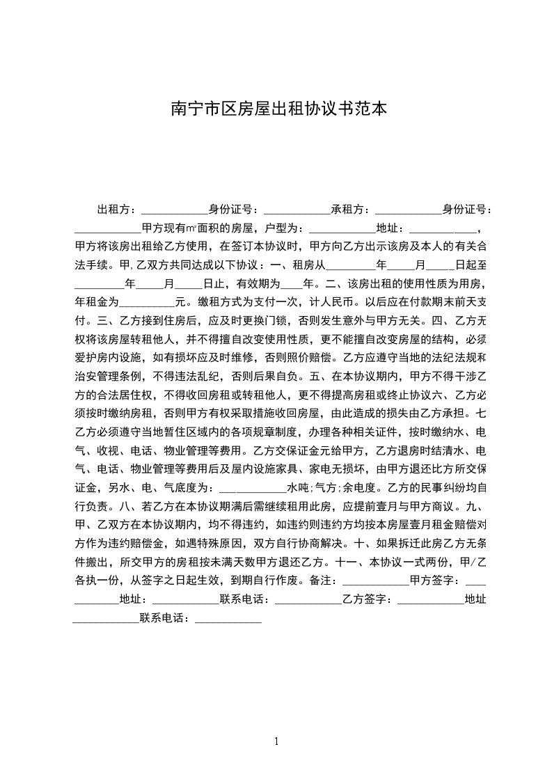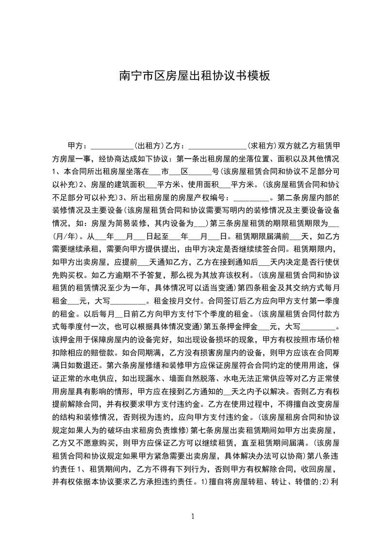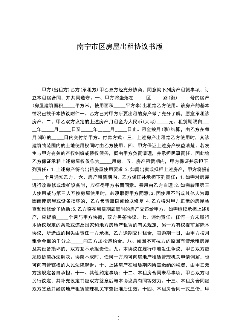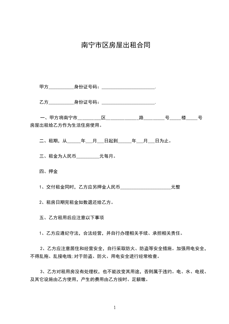 一、甲方将南宁市__________区______________路_________号_____楼_____号房屋出租给乙方作为生活住房使用。
