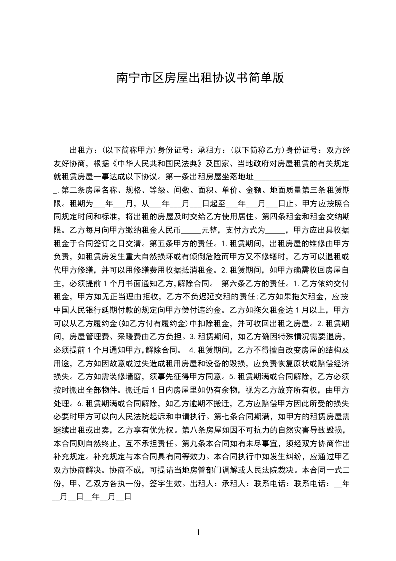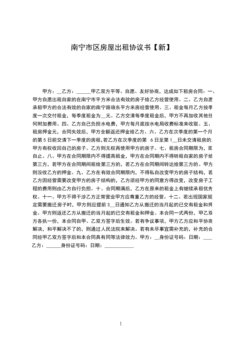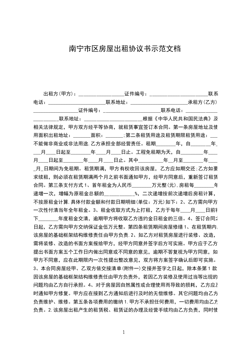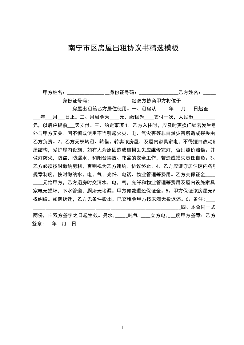一、甲方将南宁市__________区______________路_________号_____楼_____号房屋出租给乙方作为生活住房使用。