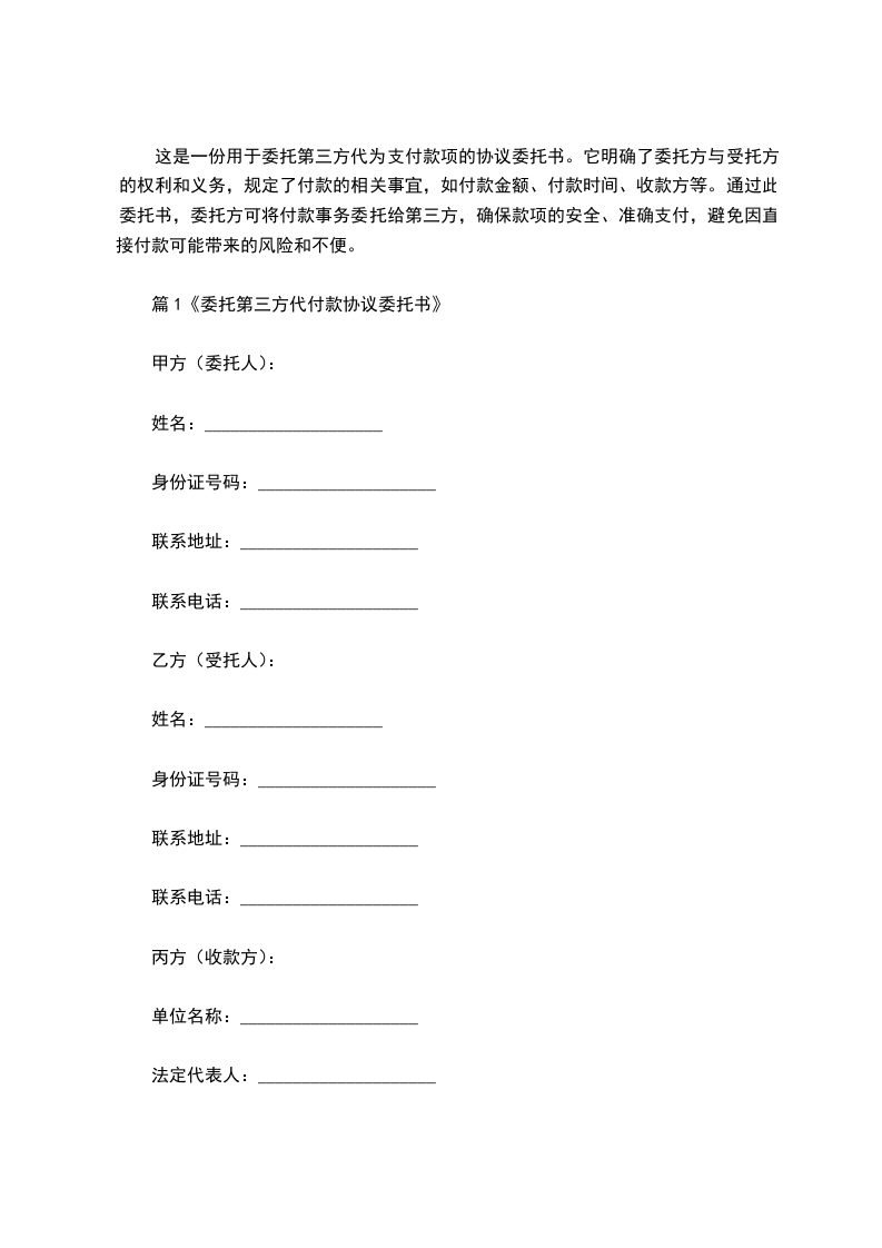1. 甲方委托乙方代其向丙方支付款项,款项金额为人民币[具体金额](大写:____________________)。