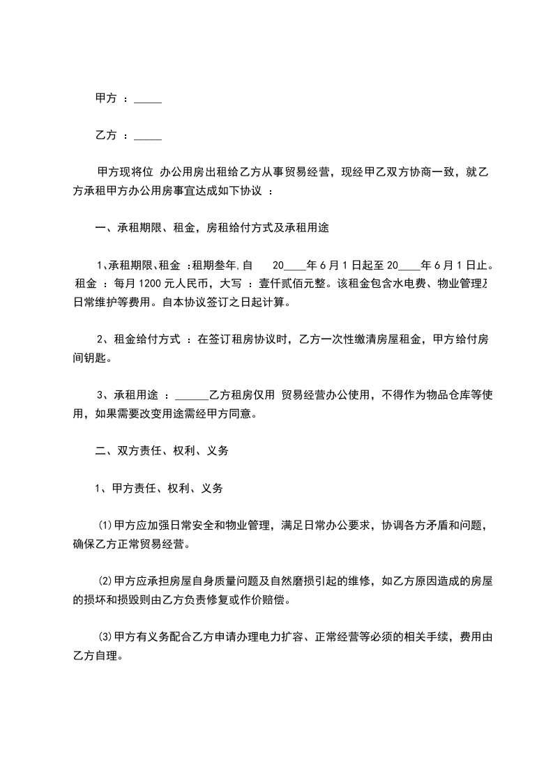 1.甲方保证房屋符合质量标准,能用于正常办公,否则乙方有权解除合同,甲方应赔偿乙方损失。