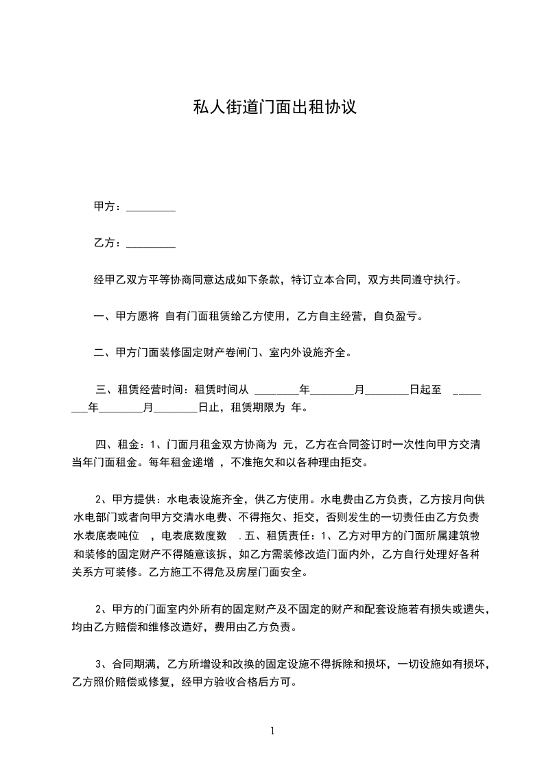 一:甲方店面包括二层租给乙方,租期为_____年,从__________年________月______日到__________年________月______日止。