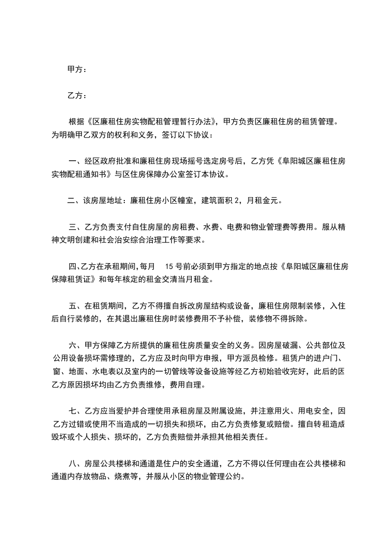 一、经区政府批准和廉租住房现场摇号选定房号后,乙方凭《阜阳城区廉租住房实物配租通知书》与区住房保障办公室签订本协议。