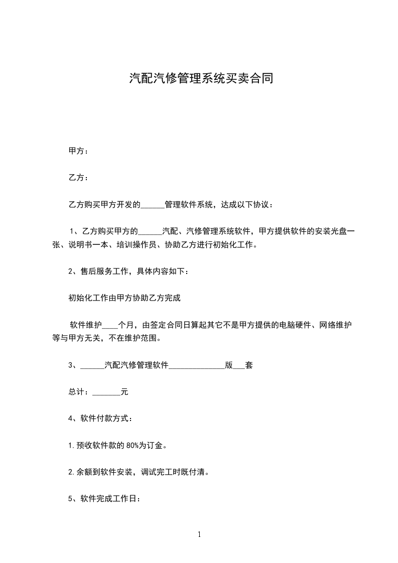 1、乙方购买甲方的______汽配、汽修管理系统软件,甲方提供软件的安装光盘一张、说明书一本、培训操作员、协助乙方进行初始化工作。