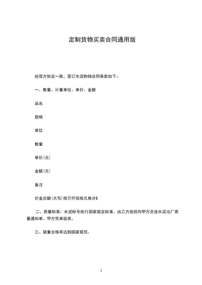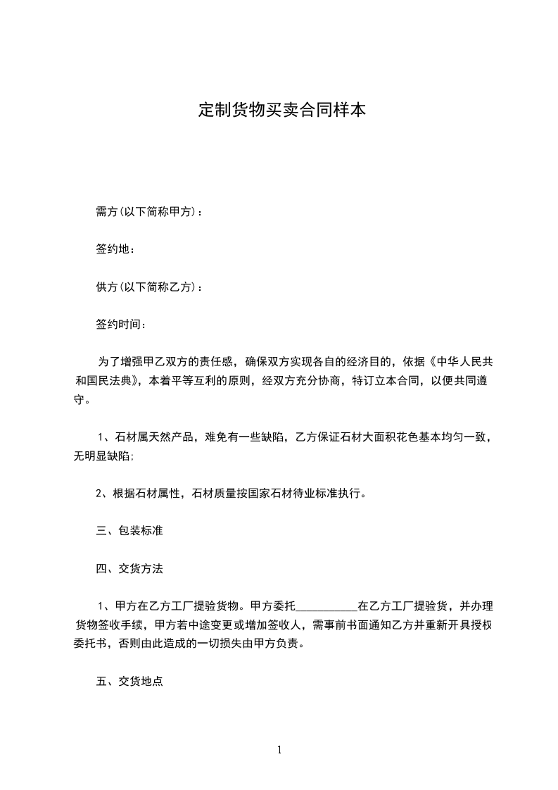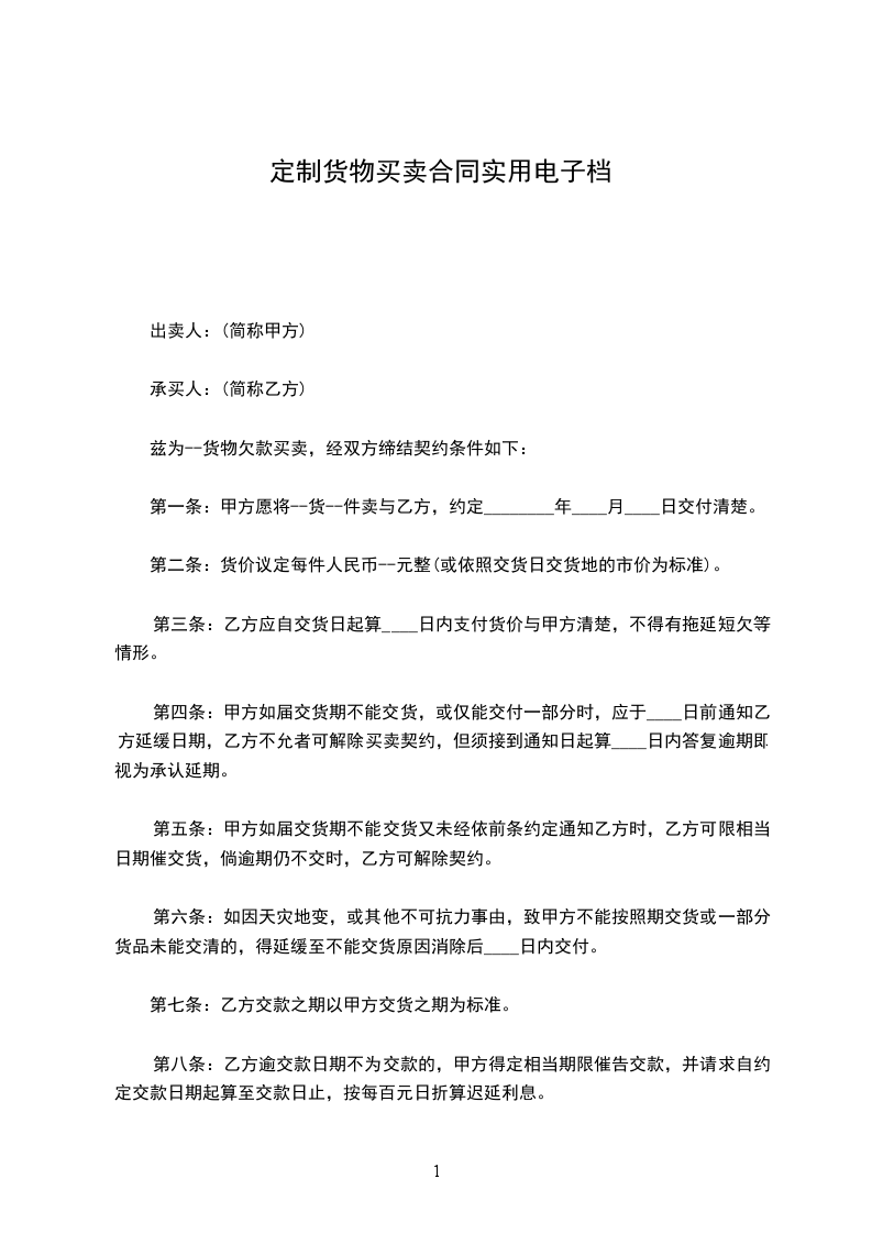 第一条乙方向甲方订购______货物,合同成立同日由甲方交付与样品同品同种同类同质的货物____件,甲方应于____日内交付乙方。