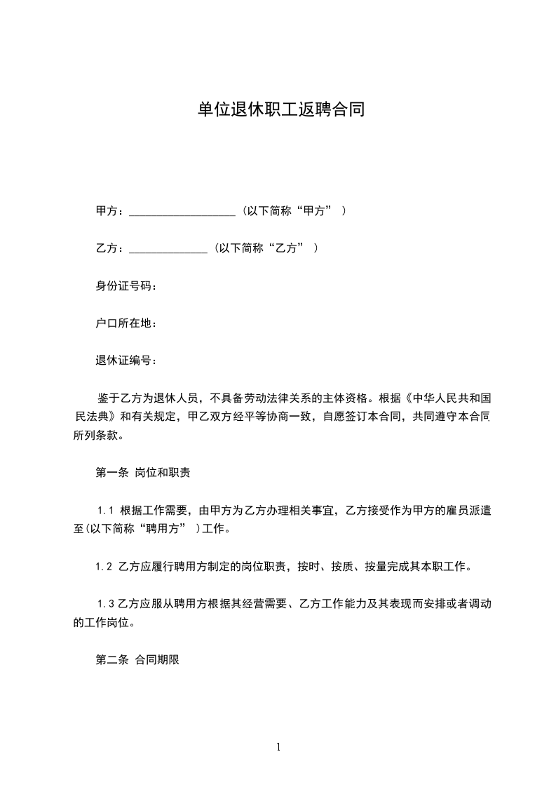 1. 乙方同意返聘至甲方______部门,担任______岗位工作。