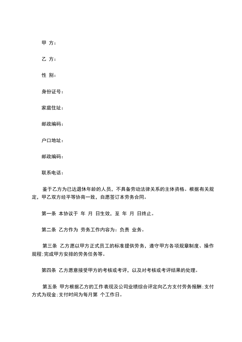 1. 乙方已享受退休待遇,甲方不再为乙方缴纳社会保险费用。