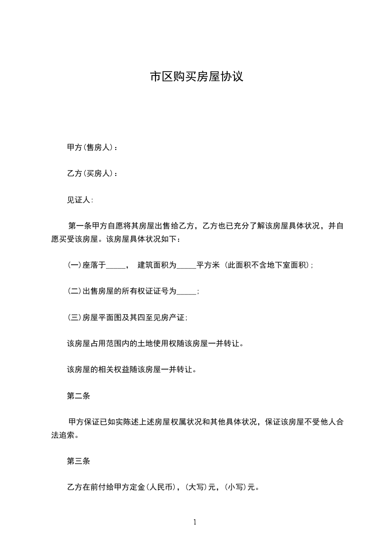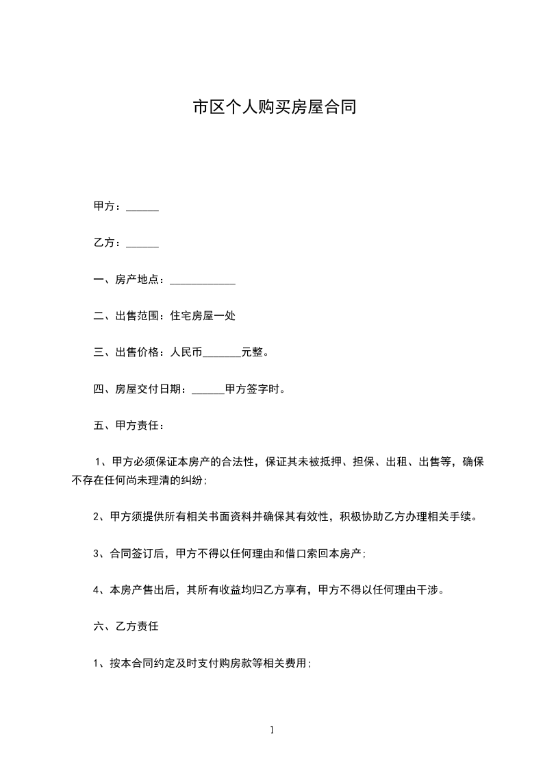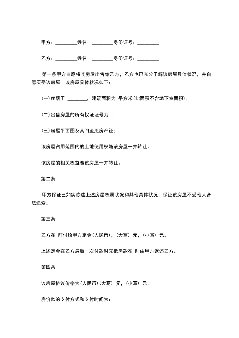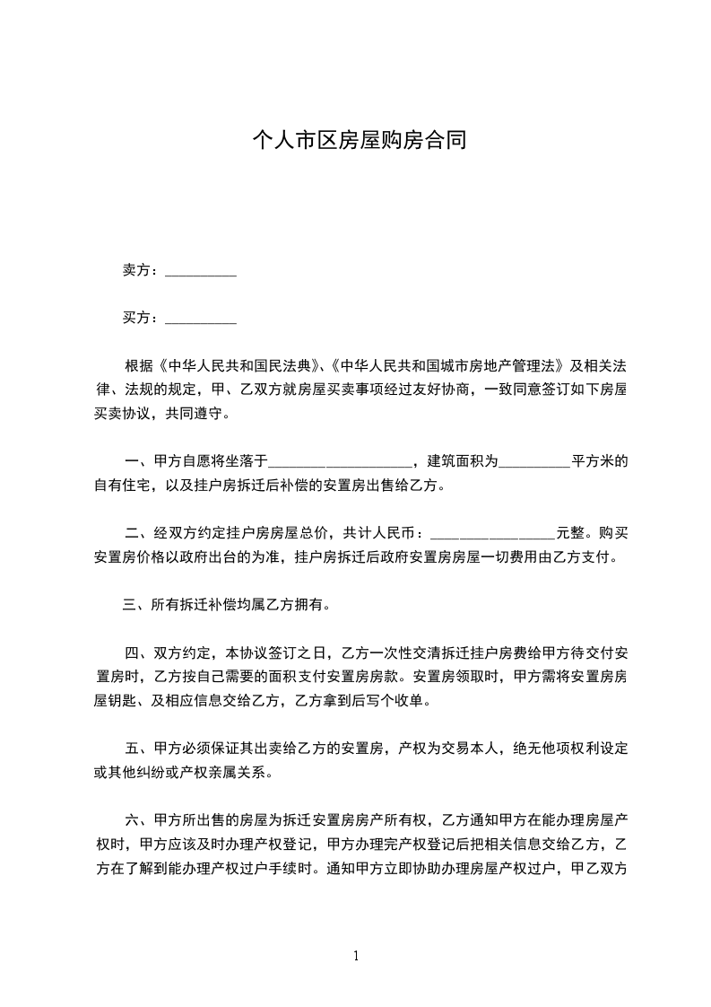 一、甲方自愿将坐落于____________________,建筑面积为__________平方米的自有住宅,以及挂户房拆迁后补偿的安置房出售给乙方。