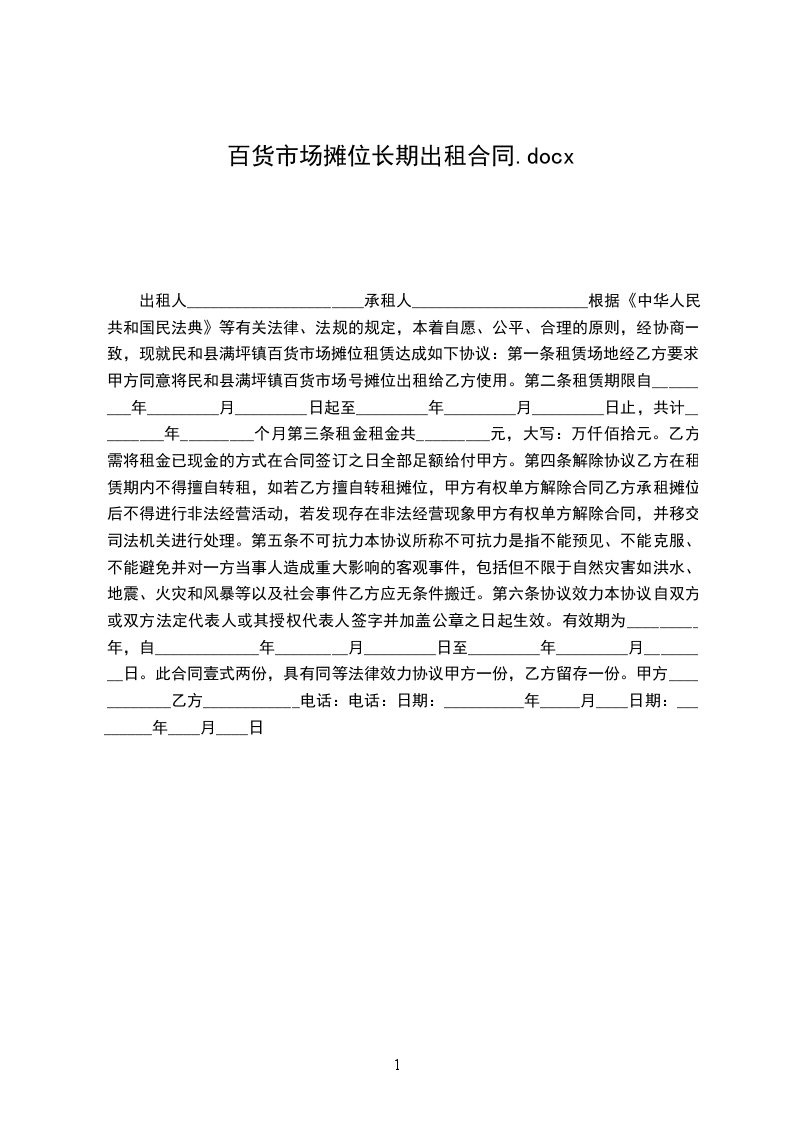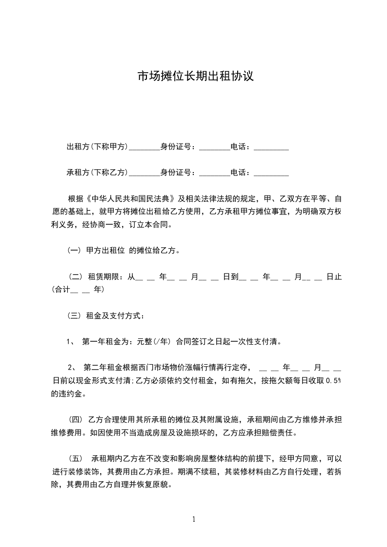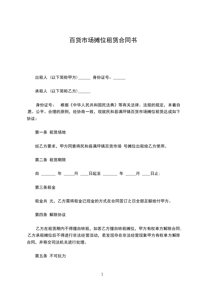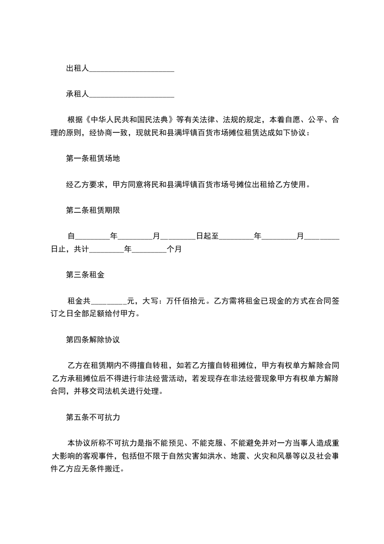 根据《中华人民共和国民法典》等有关法律、法规的规定,本着自愿、公平、合理的原则,经协商一致,现就民和县满坪镇百货市场摊位租赁达成如下协议: