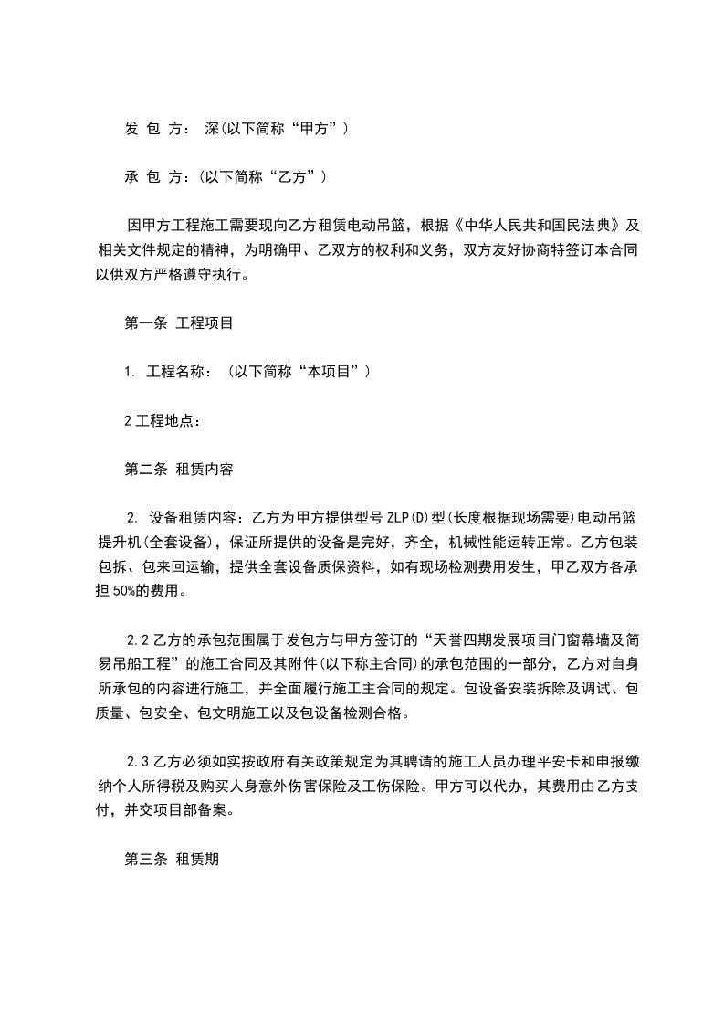 2.1设备租赁内容:乙方为甲方提供型号型电动吊篮提升机,保证所提供的设备是完好,齐全,机械性能运转正常。乙方包装包拆、包来回运输,提供全套设备质保资料,如有现场检测费用发生,甲乙双方各承担50%的费用。