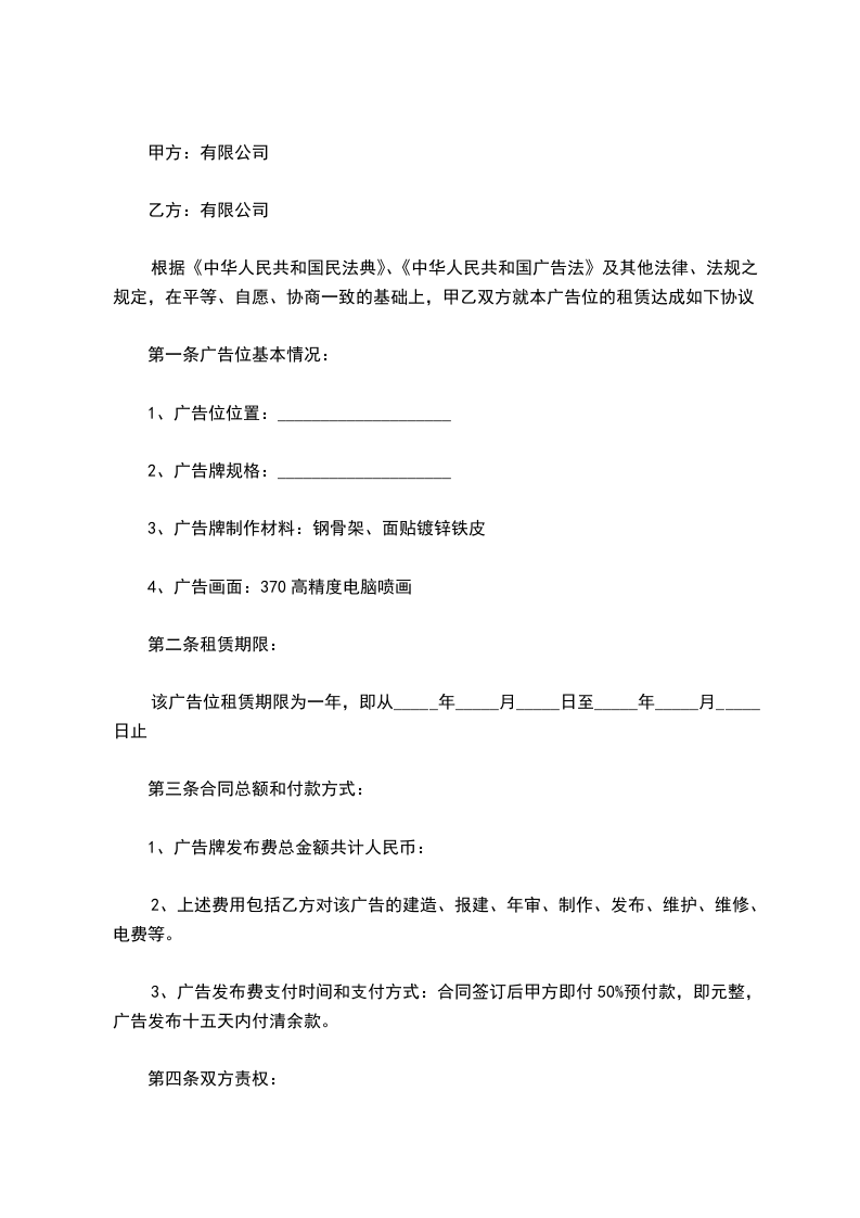 根据《中华人民共和国民法典》、《中华人民共和国广告法》及其他法律、法规之规定,在平等、自愿、协商一致的基础上,甲乙双方就本广告位的租赁达成如下协议: