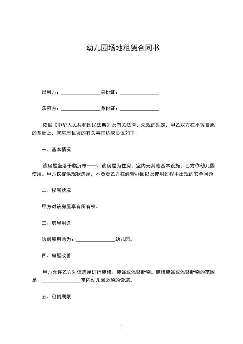 该房屋坐落于临沂市——。该房屋为住房,室内无其他基本设施,乙方作幼儿园使用。甲方仅提供现状房屋,不负责乙方在经营办园以及使用过程中出现的安全问题。