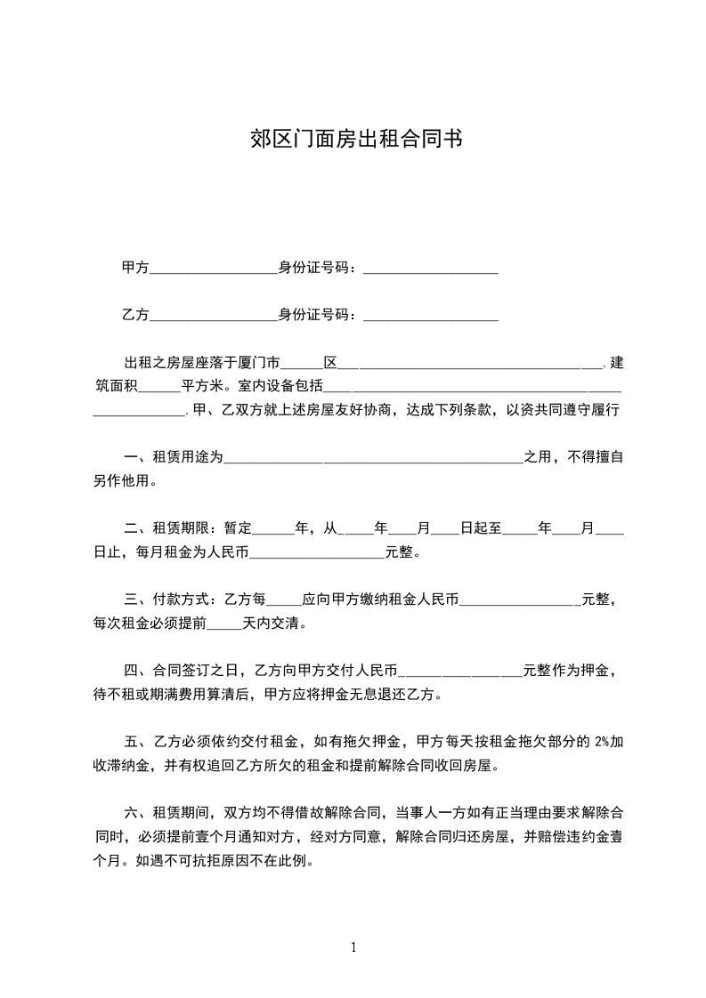 出租之房屋座落于厦门市______区_____________________________________.建筑面积______平方米。室内设备包括_______________________________________________________.甲、乙双方就上述房屋友好协商,达成下列条款,以资共同遵守履行。