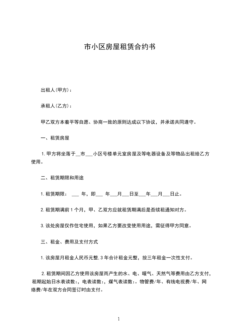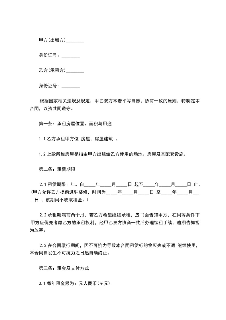 承租方:_____,男/女,身份证号码___________________________