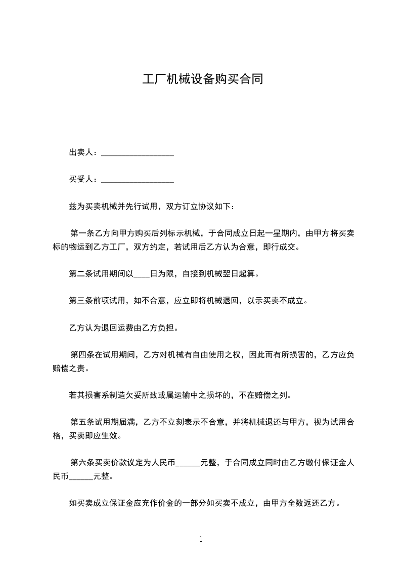 第五条试用期届满,乙方不立刻表示不合意,并将机械退还与甲方,视为试用合格,买卖即应生效。