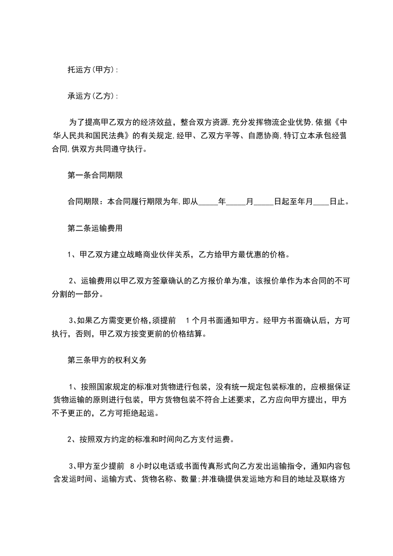 2、乙方在将货物交给收货人时,应向其索要收货凭证,作为完成运输义务的证明,持收货凭证与甲方结算。