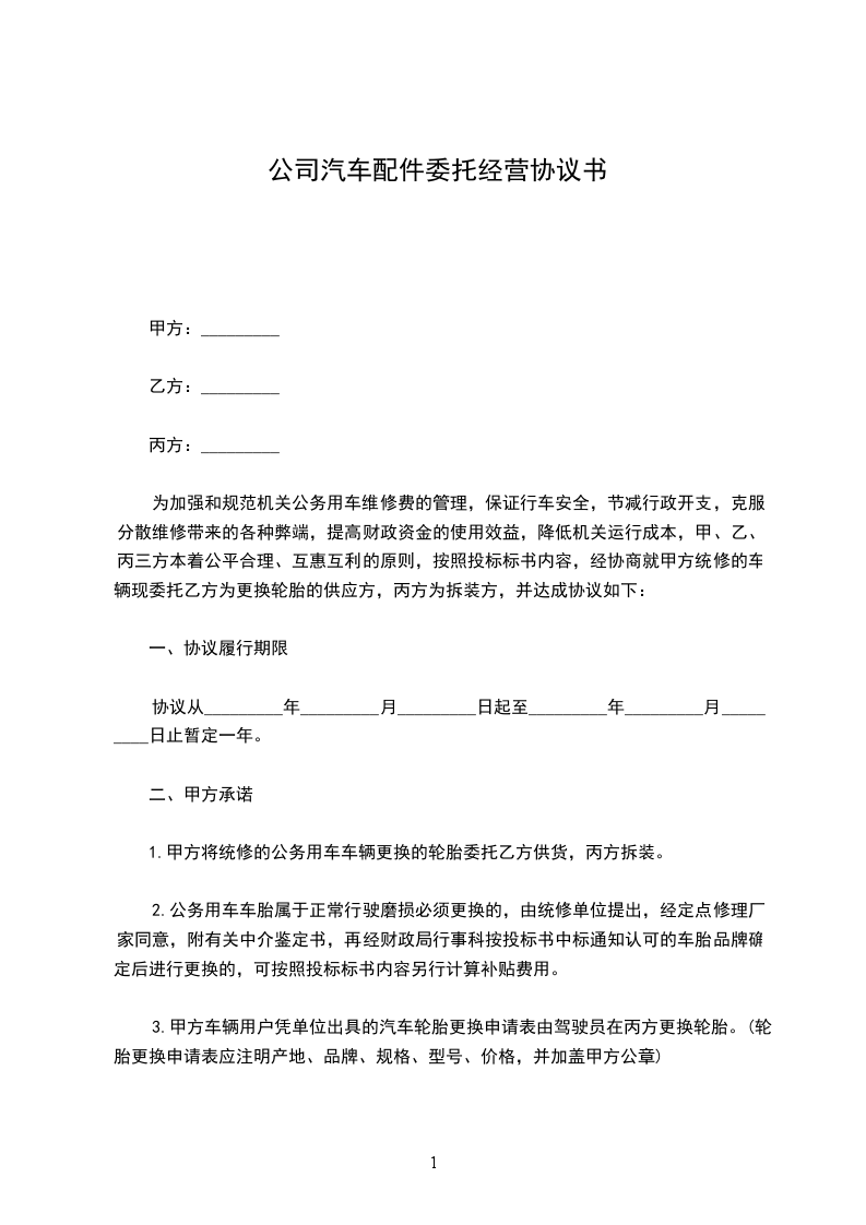 为加强和规范机关公务用车维修费的管理,保证行车安全,节减行政开支,克服分散维修带来的各种弊端,提高财政资金的使用效益,降低机关运行成本,甲、乙、丙三方本着公平合理、互惠互利的原则,按照投标标书内容,经协商就甲方统修的车辆现委托乙方为更换轮胎的供应方,丙方为拆装方,并达成协议如下: