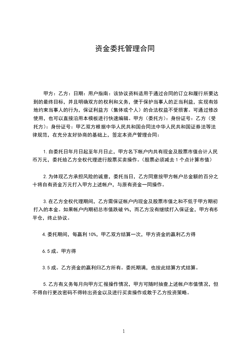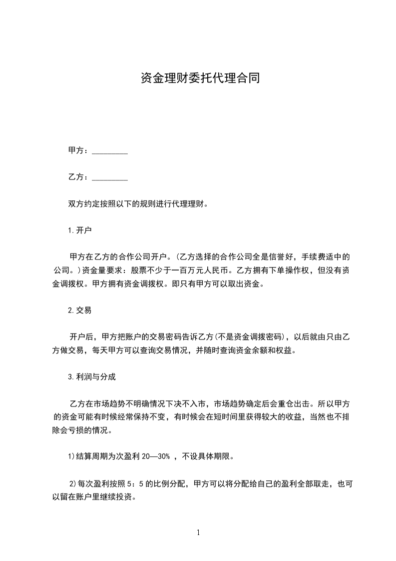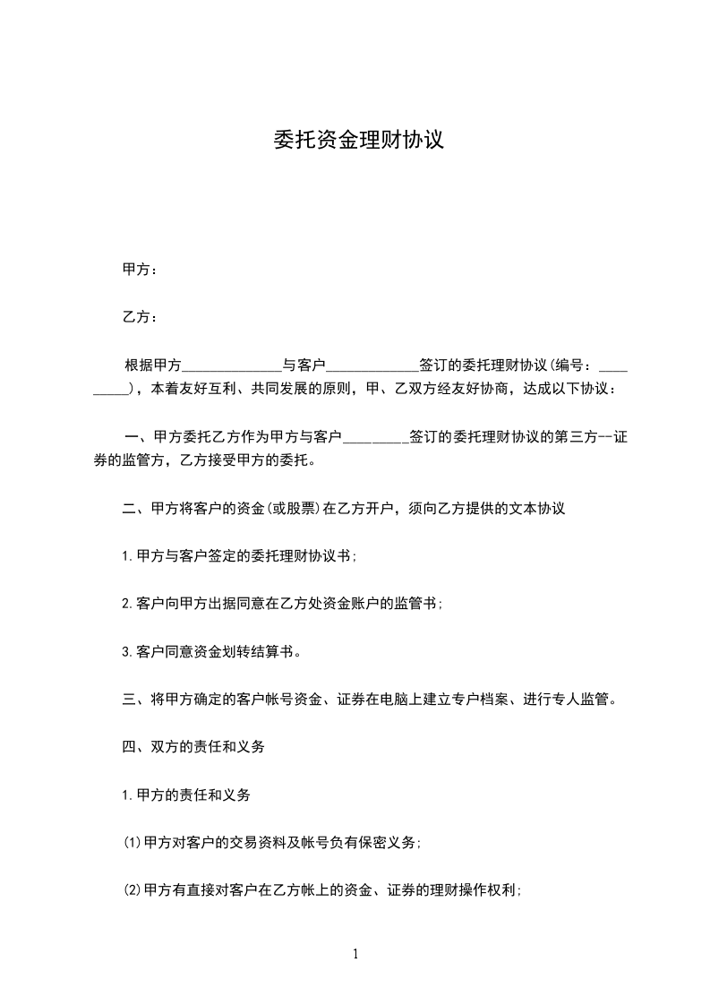 一、甲方委托乙方作为甲方与客户_________签订的委托理财协议的第三方--证券的监管方,乙方接受甲方的委托。
