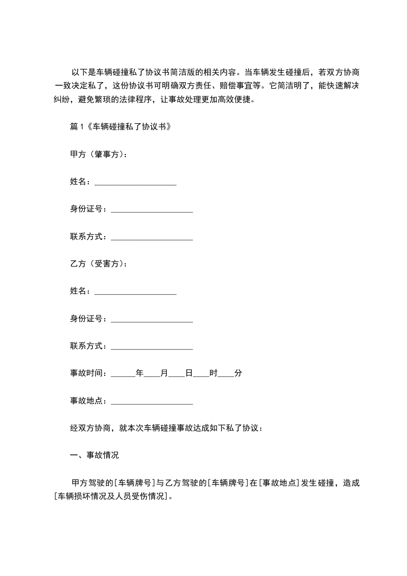 以下是车辆碰撞私了协议书简洁版的相关内容。当车辆发生碰撞后,若双方协商一致决定私了,这份协议书可明确双方责任、赔偿事宜等。它简洁明了,能快速解决纠纷,避免繁琐的法律程序,让事故处理更加高效便捷。