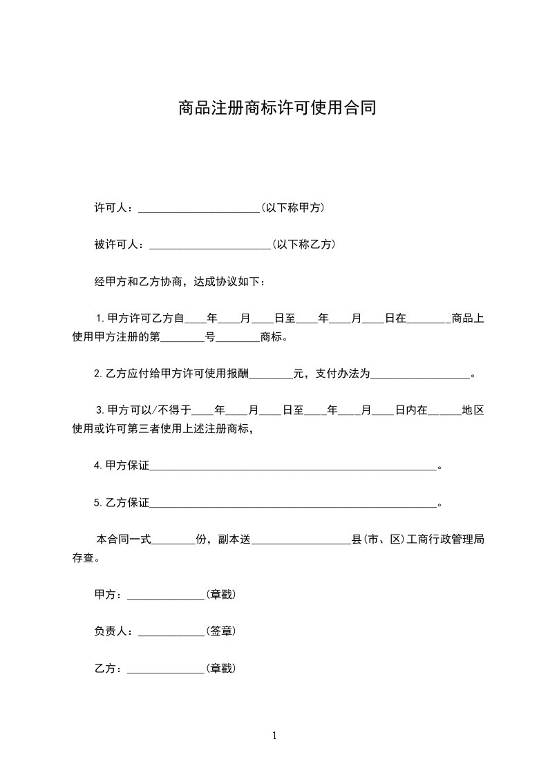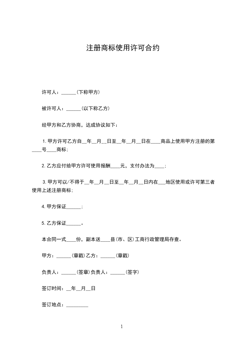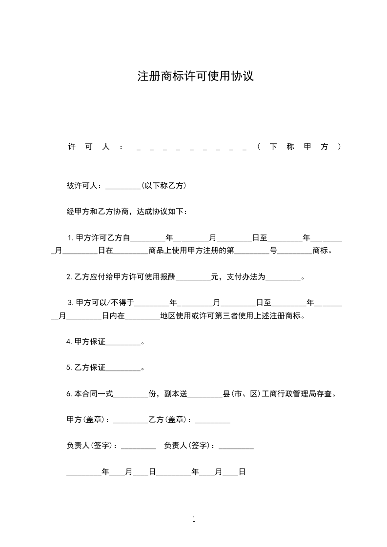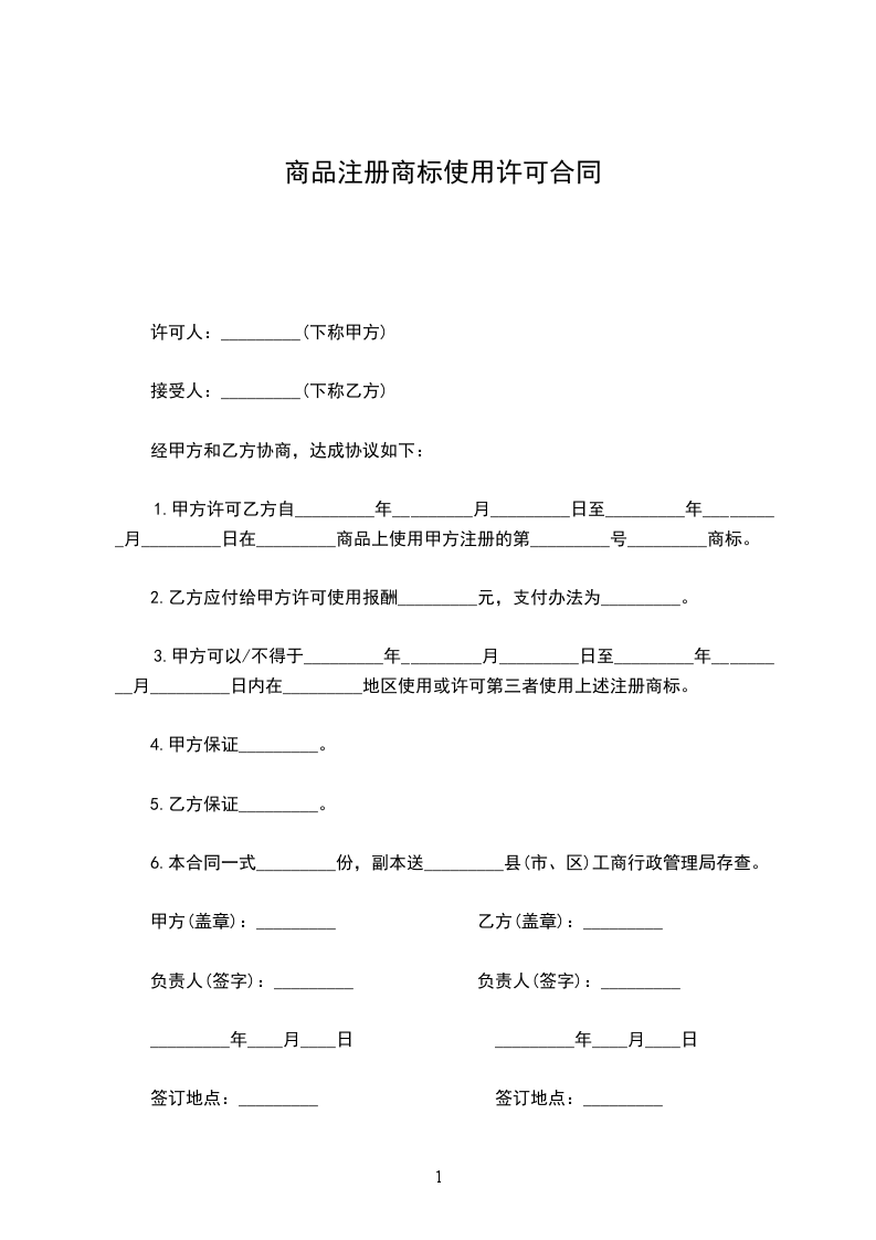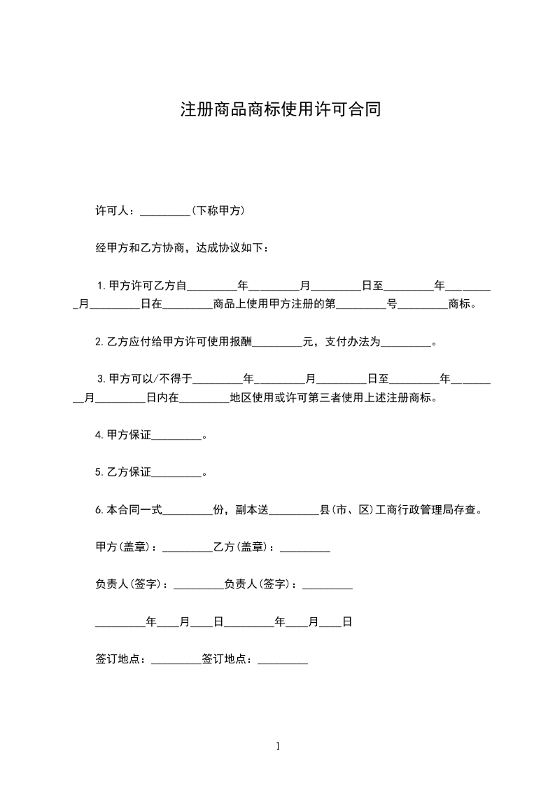 1.甲方许可乙方自_________年_________月_________日至_________年_________月_________日在_________商品上使用甲方注册的第_________号_________商标。