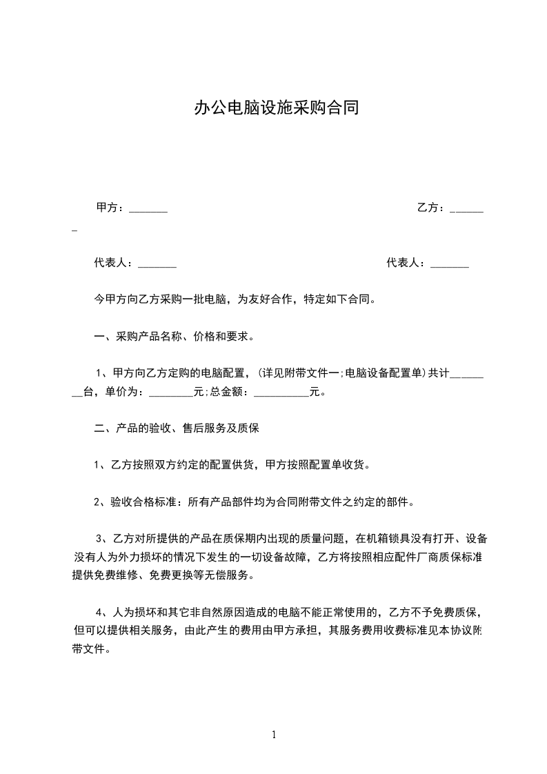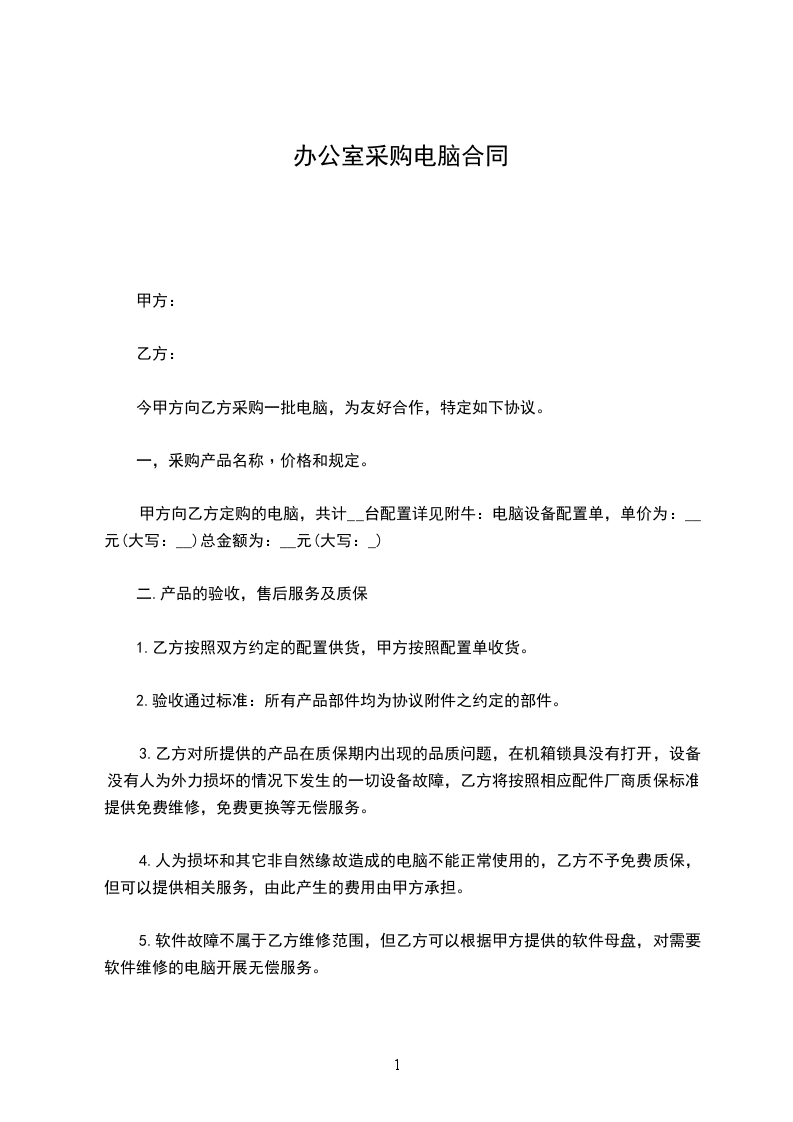 甲方向乙方定购的电脑,共计__台配置详见附牛:电脑设备配置单,单价为:__元(大写:__)总金额为:__元(大写:_)