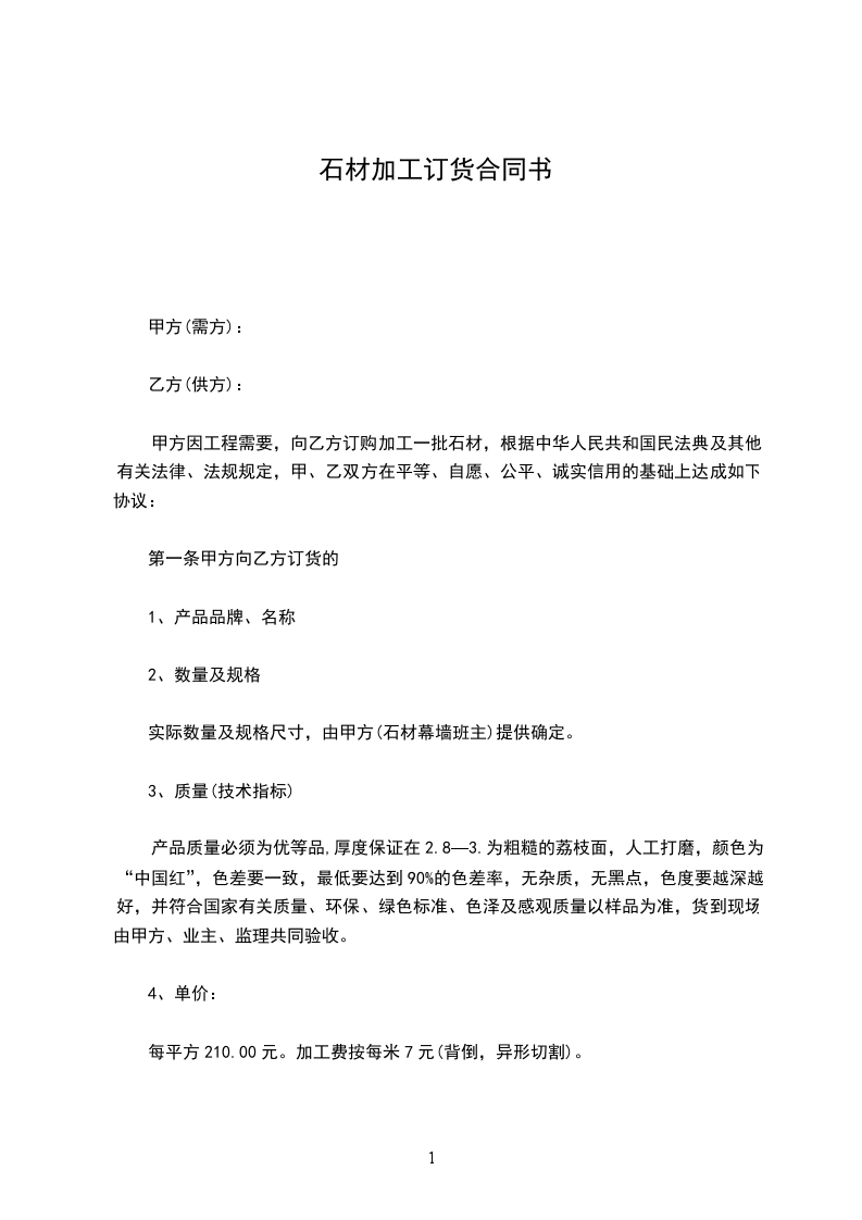 甲方因工程需要,向乙方订购加工一批石材,根据中华人民共和国民法典及其他有关法律、法规规定,甲、乙双方在平等、自愿、公平、诚实信用的基础上达成如下协议: