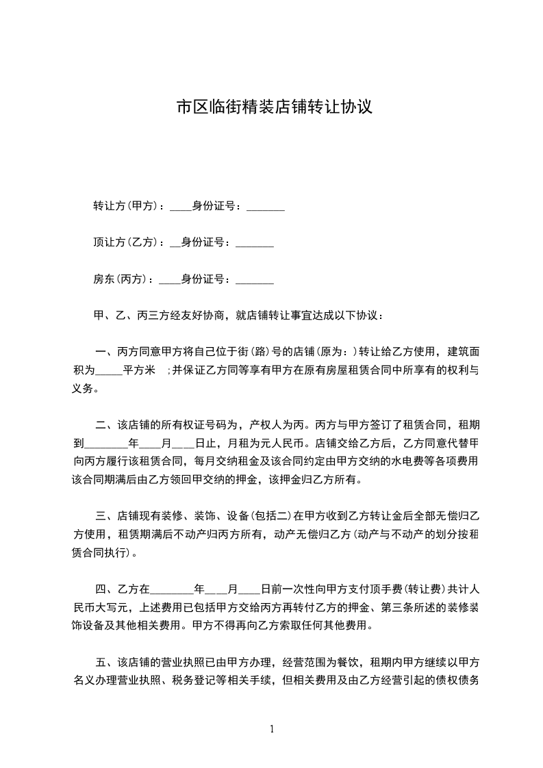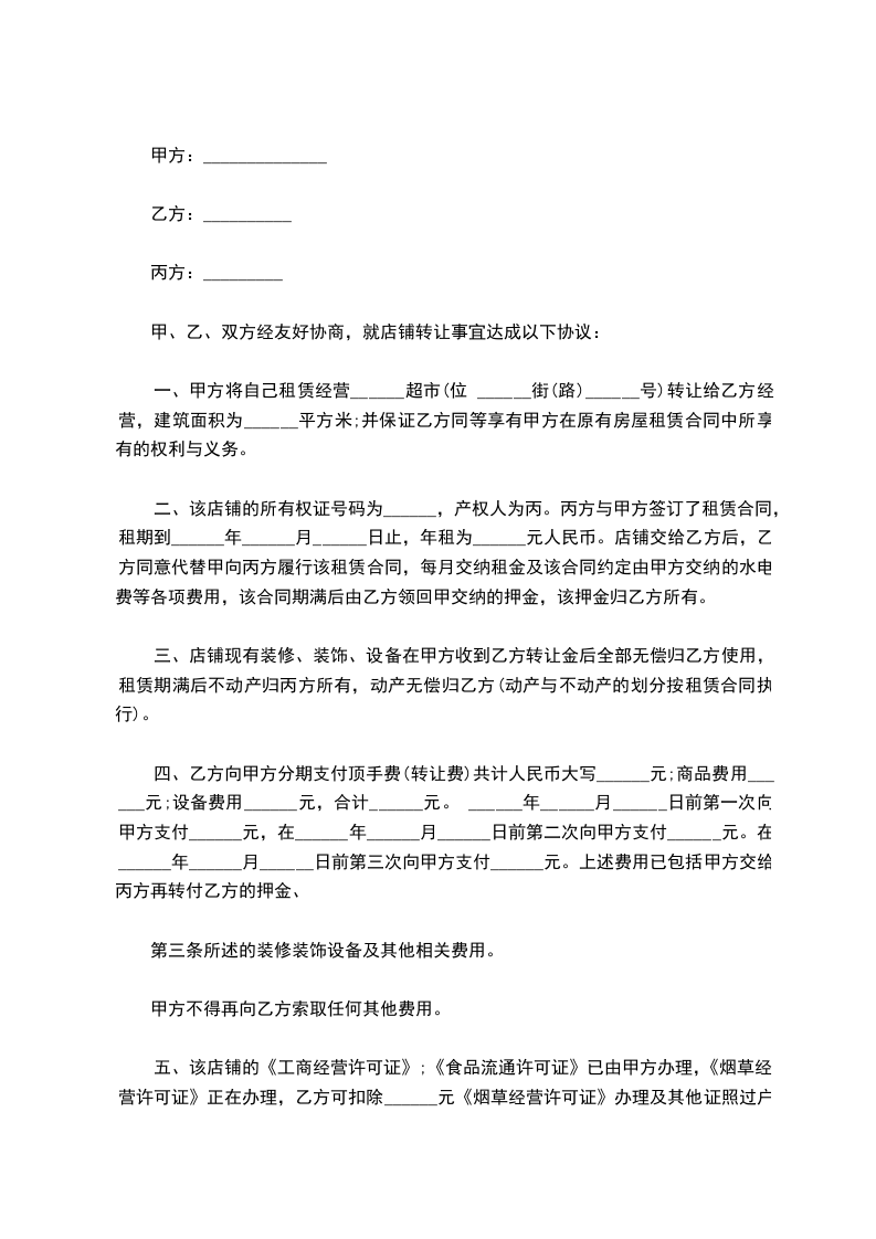 甲、乙、丙三方经友好协商,就门面转让事宜达成以下协议: