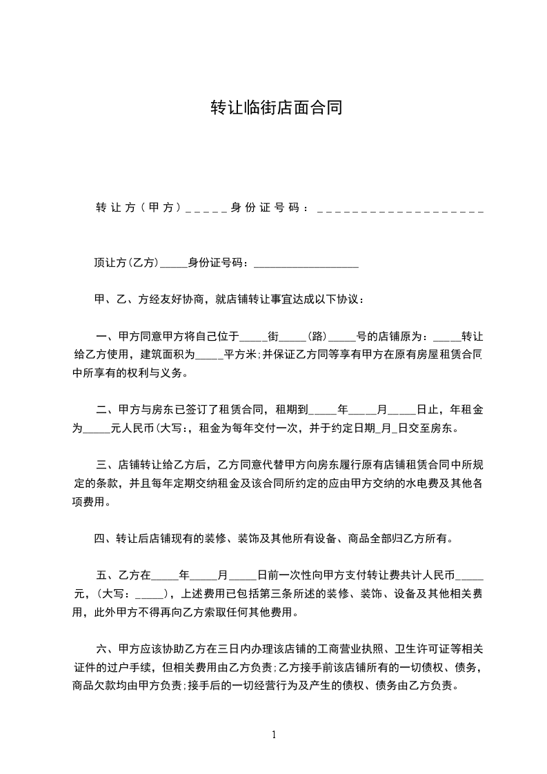 五、乙方于本合同签订之日向甲方支付定金_______元。甲方在合同签订次日向乙方腾让门面并交付钥匙,同时乙方向甲方支付转让费共计人民币_______元,(大写:_______),上述费用已包括第三条所述的装修、装饰、设备及其他相关费用,此外甲方不得再向乙方索取任何其他费用。