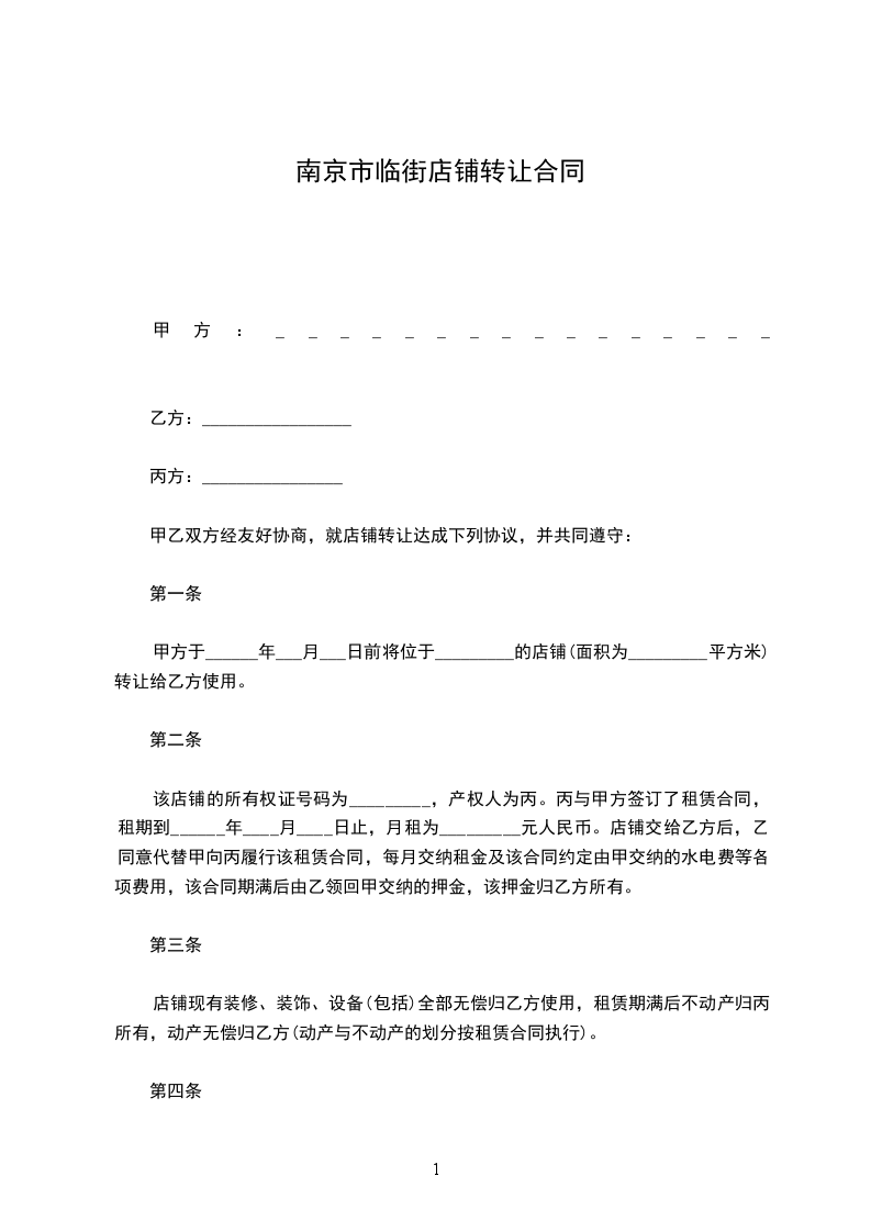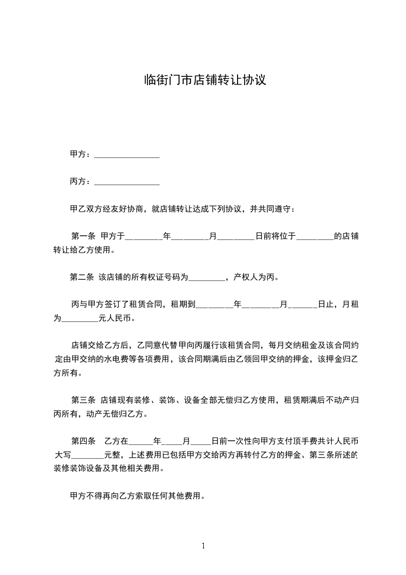 一、丙方同意甲方将自己位于____________街(路)____________号的门面转让给乙方使用,建筑面积为____________平方米;并保证乙方同等享有甲方在原有房屋中所享有的权利与义务,在甲方转让租期满后,租期按照原租赁协议顺延年,并由乙方与丙方按原合同条款重新签订租赁合同。不重新签订租赁合同不影响租期自动顺延。