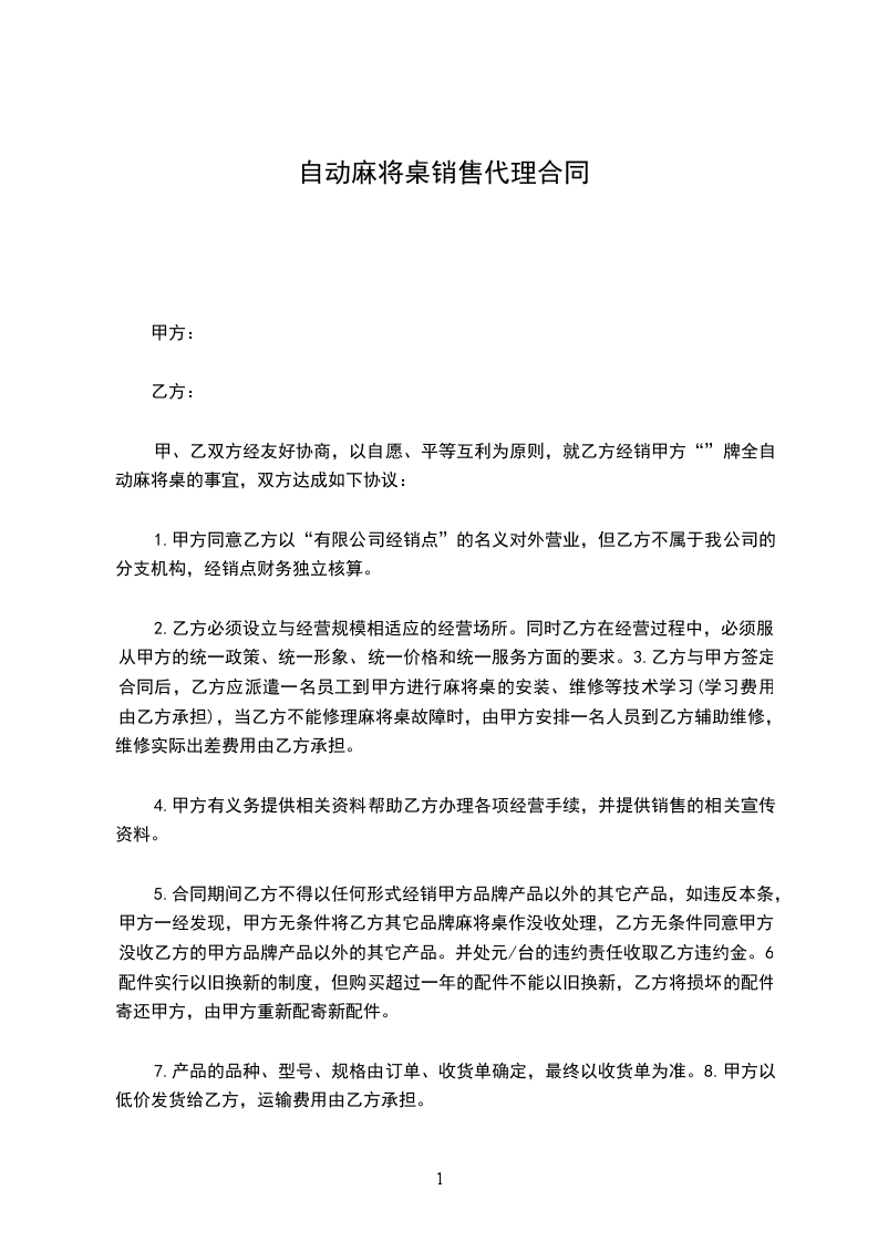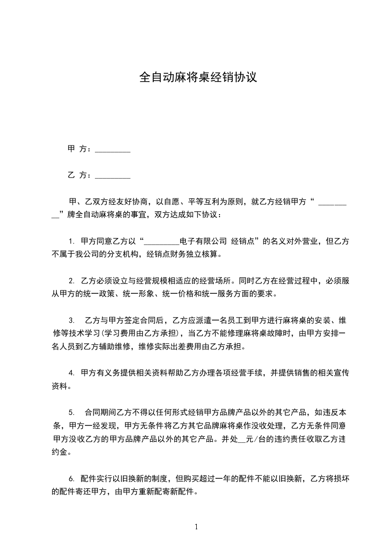 甲、乙双方经友好协商,以自愿、平等互利为原则,就乙方经销甲方“”牌全自动麻将桌的事宜,双方达成如下协议:
