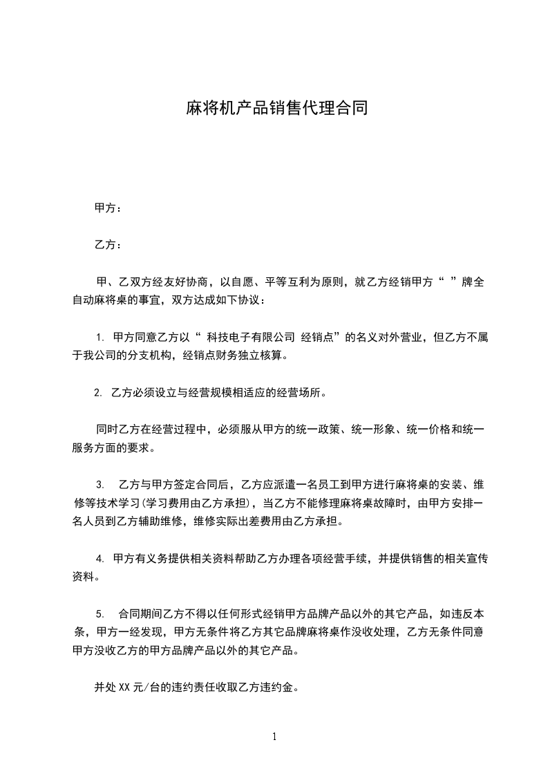 5.合同期间乙方不得以任何形式经销甲方品牌产品以外的其它产品,如违反本条,甲方一经发现,甲方无条件将乙方其它品牌麻将桌作没收处理,乙方无条件同意甲方没收乙方的甲方品牌产品以外的其它产品。并处元/台的违约责任收取乙方违约金。6.配件实行以旧换新的制度,但购买超过一年的配件不能以旧换新,乙方将损坏的配件寄还甲方,由甲方重新配寄新配件。