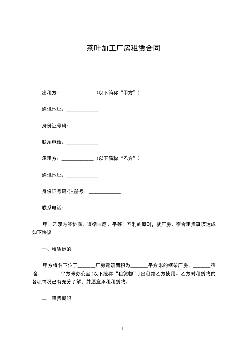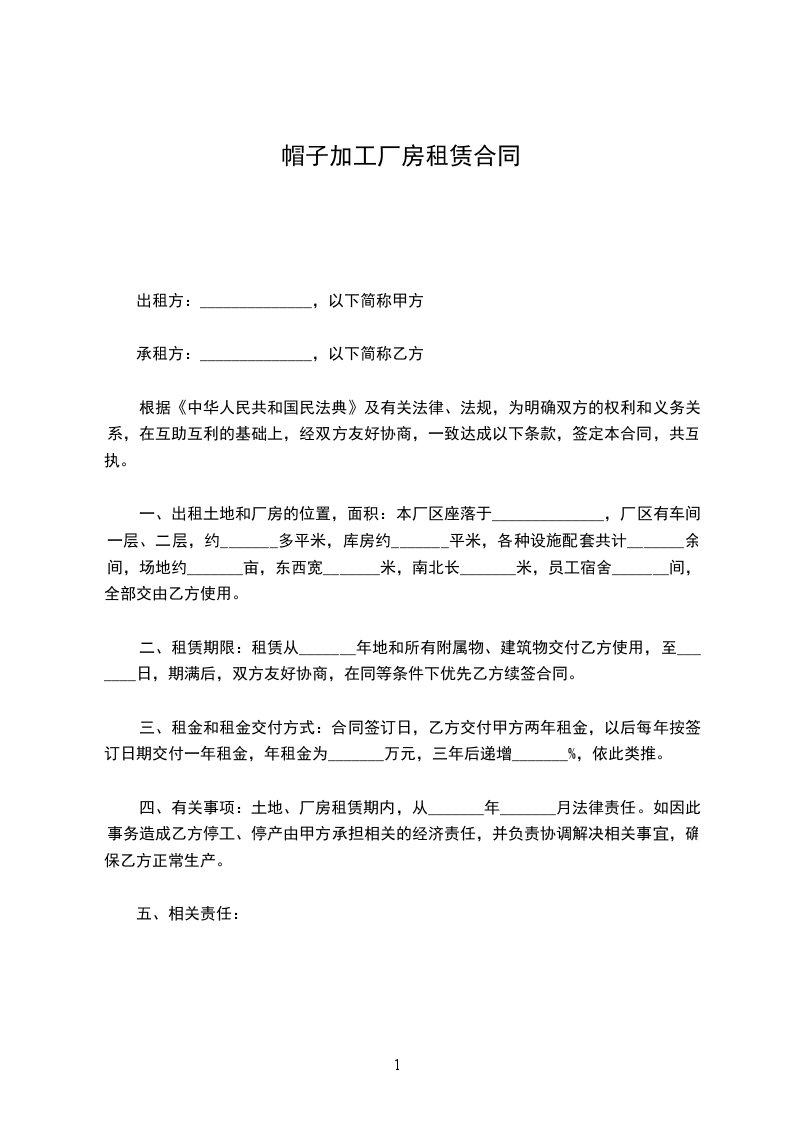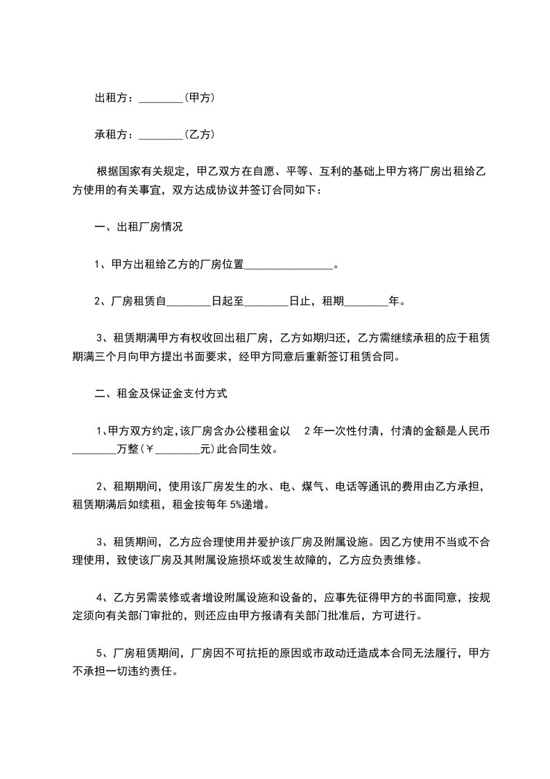 一、甲方自愿将坐落在:_______________,厂房使用面积平方米出租给乙方使用,厂房包括机器设备及部分附属房间。乙方已对甲方所要承租的厂房做了充分了解,愿意承包该厂房。