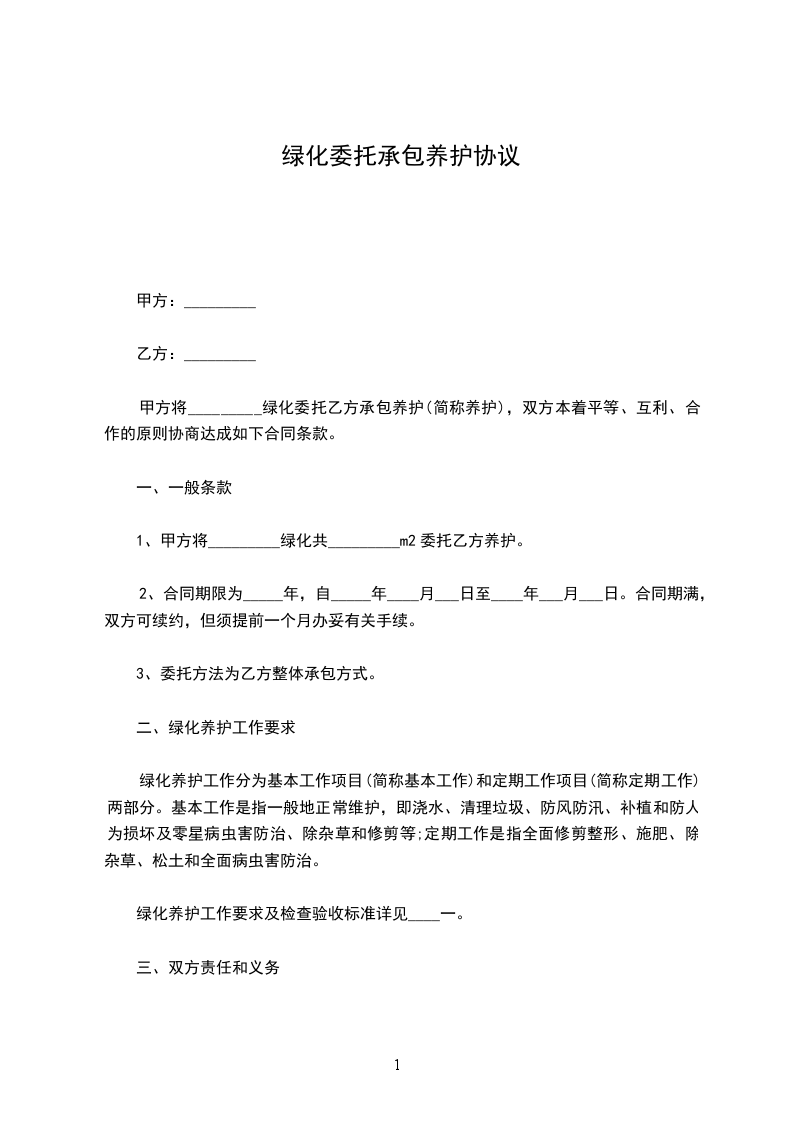 1.由甲方委托乙方对小区绿化(地)进行养护工作,为期一年。其中包括:中心绿地所有绿化