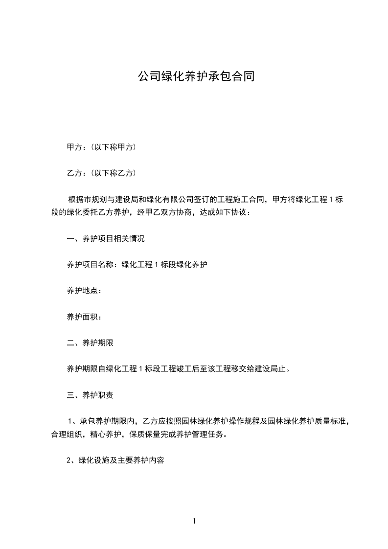 根据市规划与建设局和绿化有限公司签订的工程施工合同,甲方将绿化工程1标段的绿化委托乙方养护,经甲乙双方协商,达成如下协议: