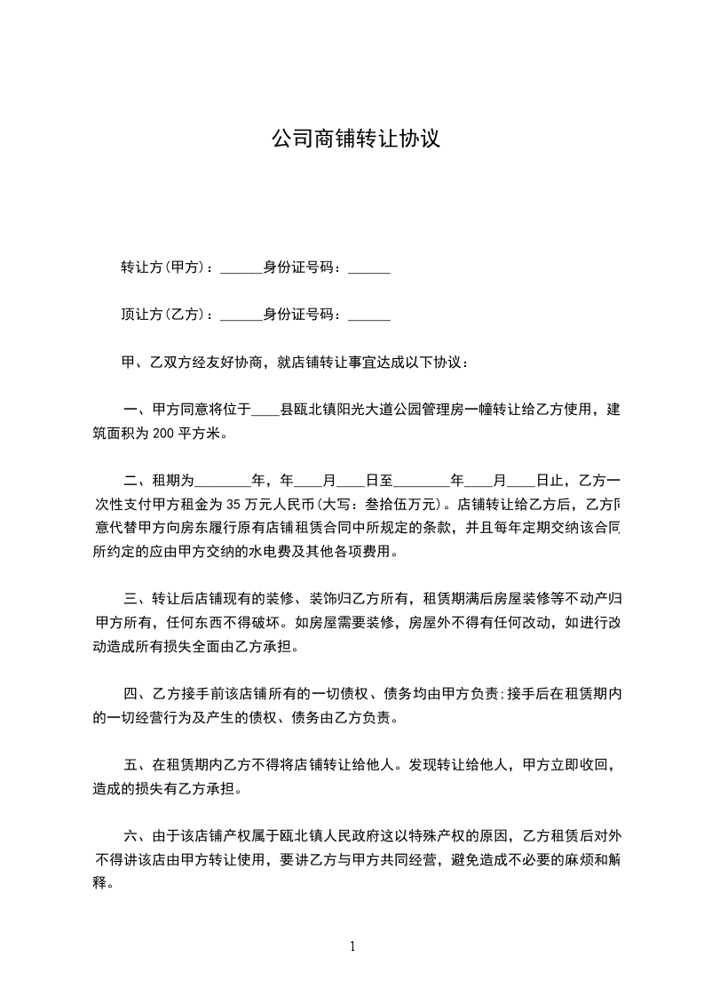 第一条甲方与______年____月____日前将位于商铺(面积平方米)转让给乙方使用。